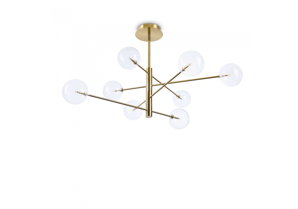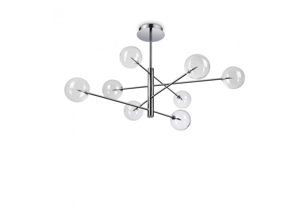 Equinoxe entworfen und hergestellt von Ideal Lux ist eine Hängeleuchte mit Rosette und tragender Struktur aus Metallrohr. Die röhrenförmigen Arme tragen kugelförmige Diffusoren aus transparentem mundgeblasenem Glas und schirmen LED-Lichtquellen ab. Equinoxe ist in verschiedenen Modellen und Ausführungen erhältlich.