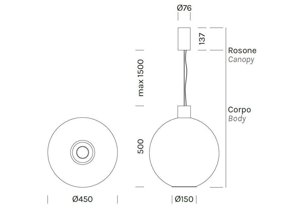 Beam Stick Nuance 450 von Marc Sadler für Olev entworfen, ist eine Hängeleuchte aus Aluminium und mundgeblasenem Glas, erhältlich in verschiedenen Ausführungen. Schwarzes Kabel.