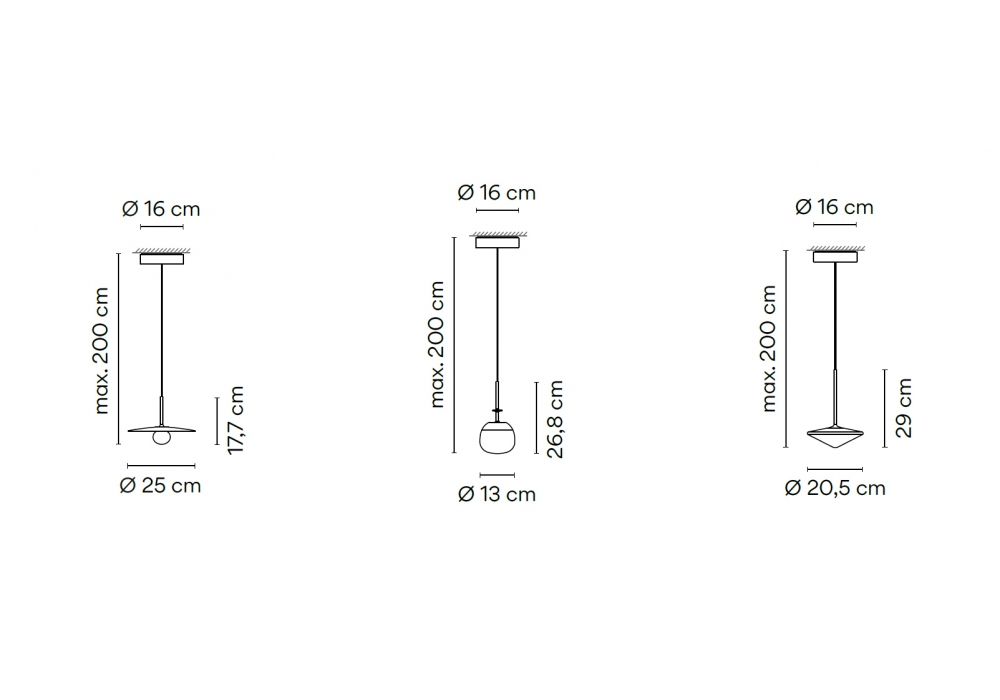 | Abmessungen | Ø 25 x H 17,7 cm Max 200 cm; Ø 13 x H 26,8 cm Max 200 cm; Ø 20,5 x H 29 cm Max 200 cm. |