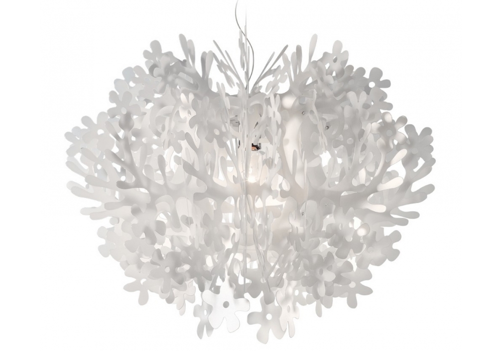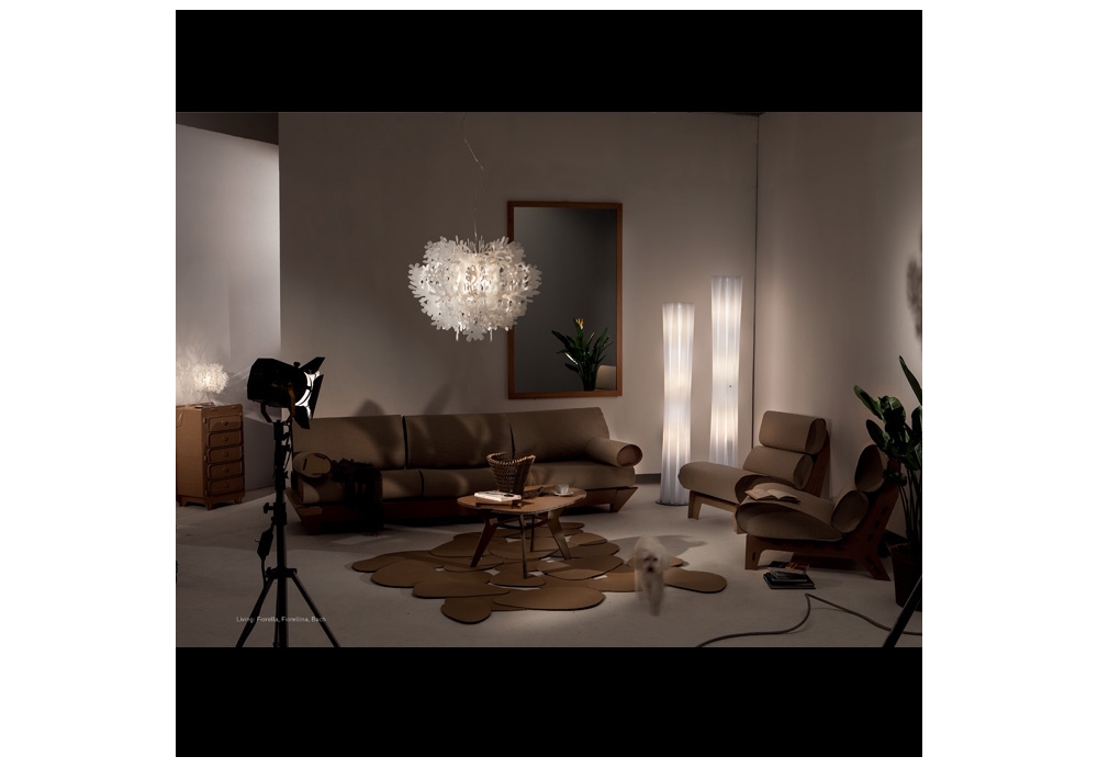 Fiorella von Nigel Coates für Slamp entworfen ist eine Hängeleuchte die vollständig aus weißem Opalflex®/Cristalflex® besteht. Der Diffusor besteht aus verschiedenen Elementen, die sich nach außen verzweigen und eine dimmbare Filament-LED-Lichtquelle abschirmen.