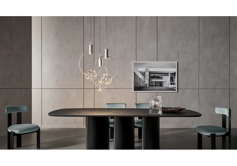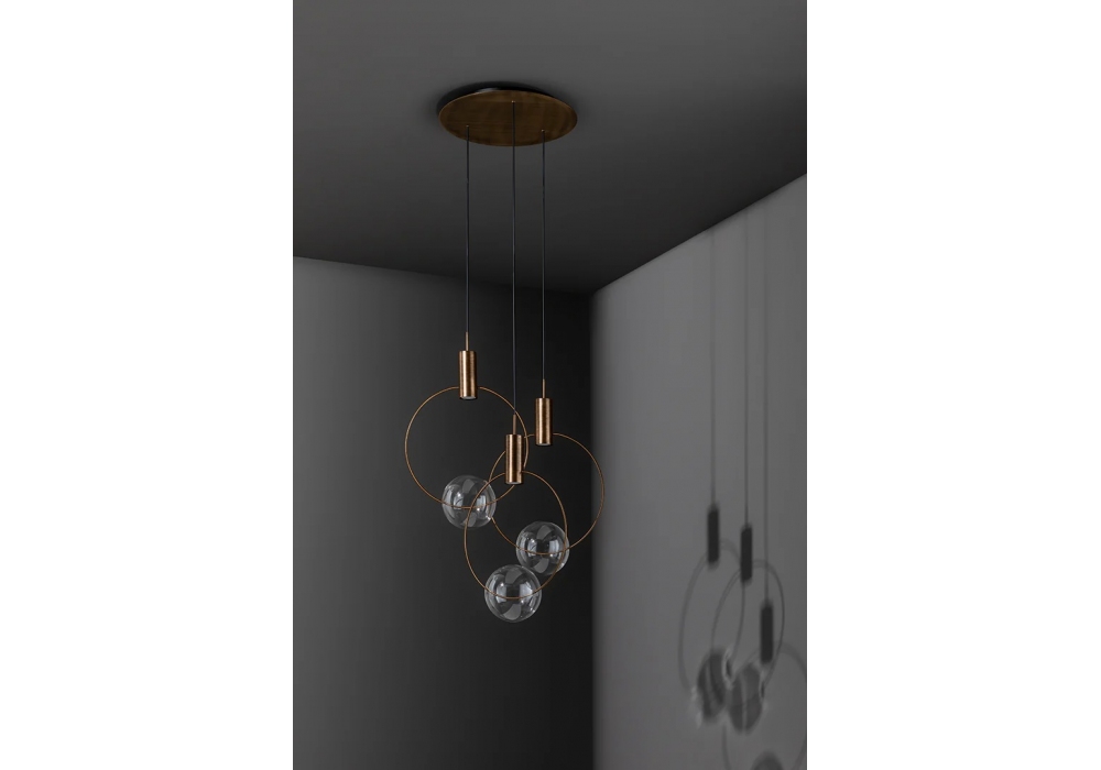 Keshi von Bonaldo Lab für Bonaldo entworfen, ist eine Hängelampe mit transparentem Glaslampenschirm, Metallstruktur in Nickel- oder Bronze-Kupfer-Ausführung und Rosette in der gleichen Ausführung wie die Struktur. Auch in verschiedenen Versionen erhältlich.