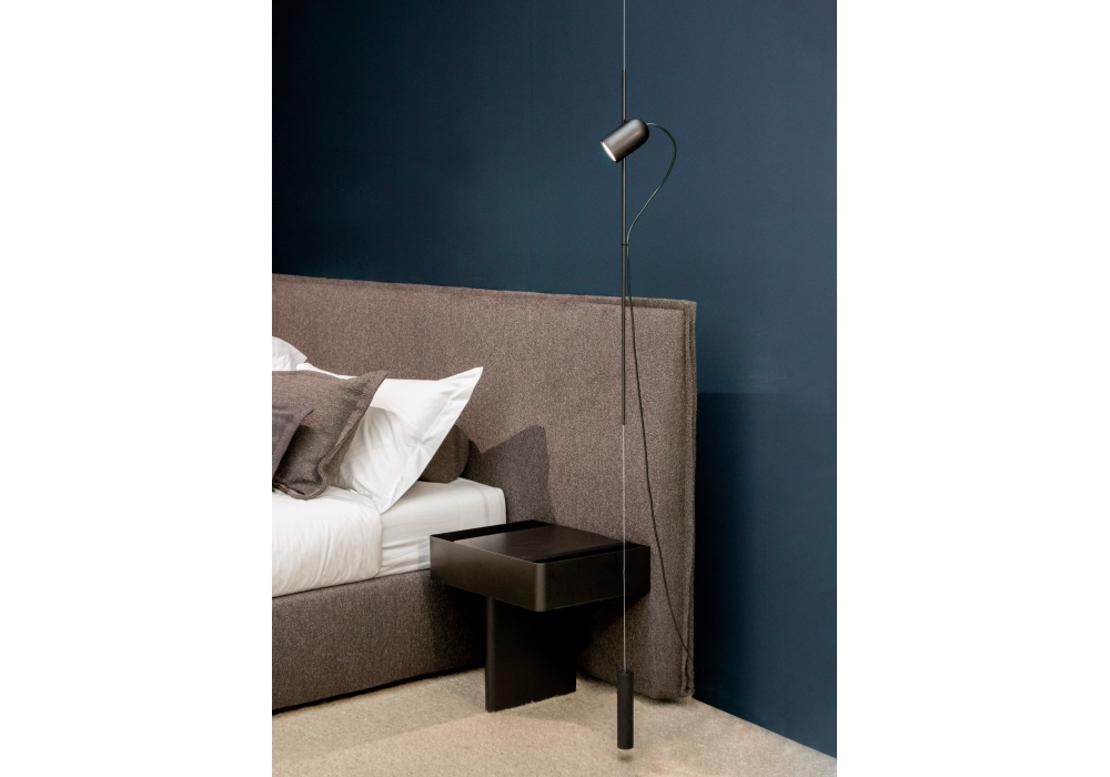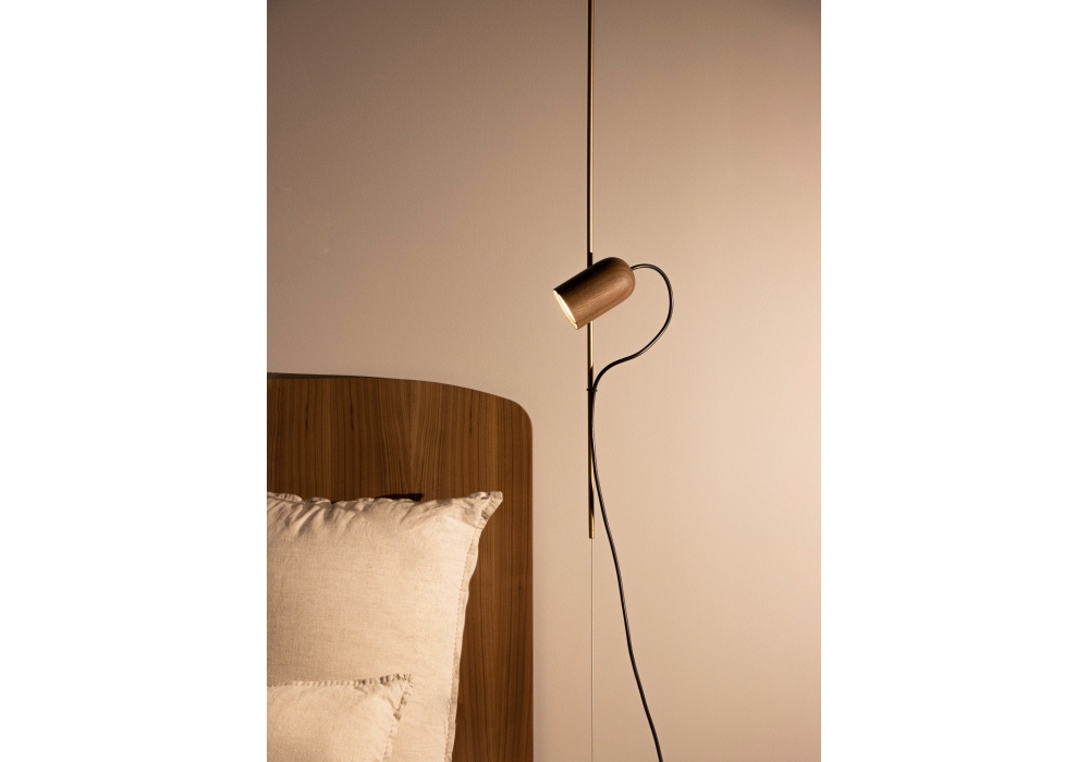 Onfa von Goula/Figuera Studio für Nomon entworfen ist eine Hängelampe mit einer vertikalen röhrenförmigen Metallstruktur mit einem Gleitsystem an einem Stahlkabel. Der Diffusor ist verstellbar, zylindrisch geformt und aus Holz mit Metalldetails gefertigt und verfügt über eine LED-Lichtquelle mit dimmbarem GU10-Einsatz. Onfa ist in verschiedenen Ausführungen erhältlich.