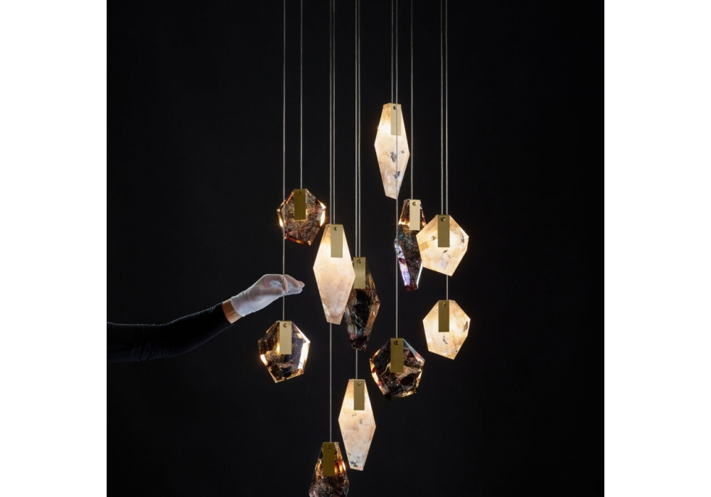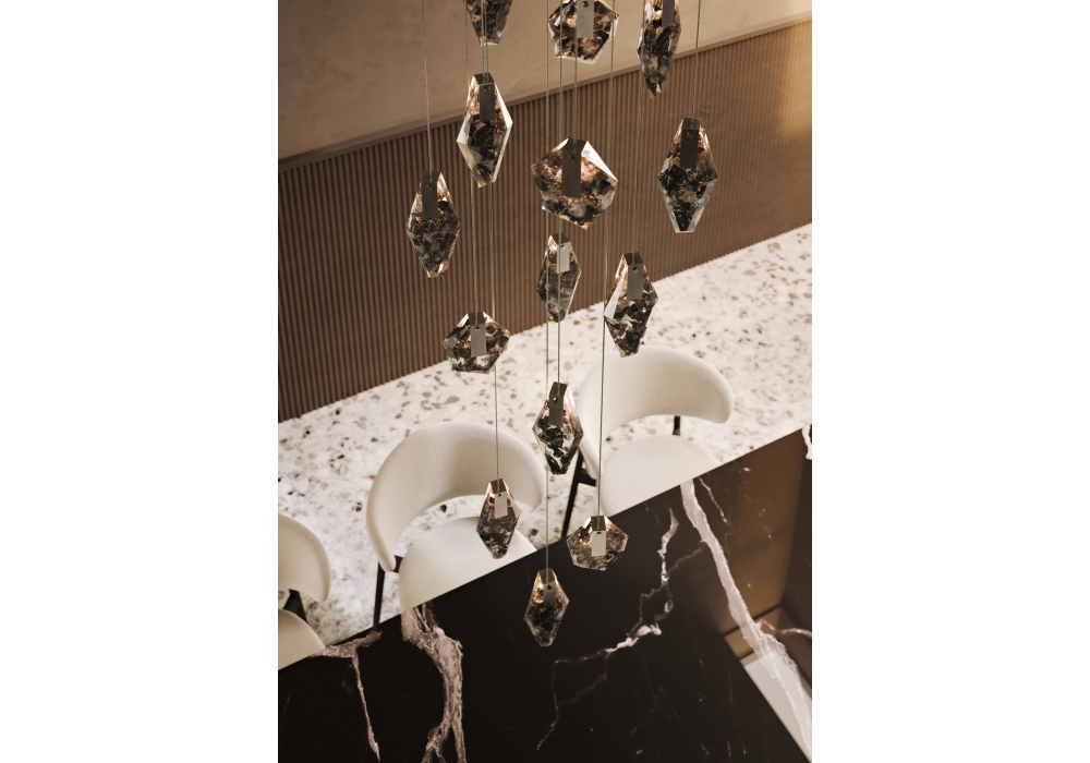 Fragments von DECHEM Studio für Bomma entworfen, ist eine Hängeleuchte mit Fragmentglasdiffusor und Details aus gebürstetem Gold oder Anthrazit. Verfügbar in mehreren Ausführungen und Abmessungen.