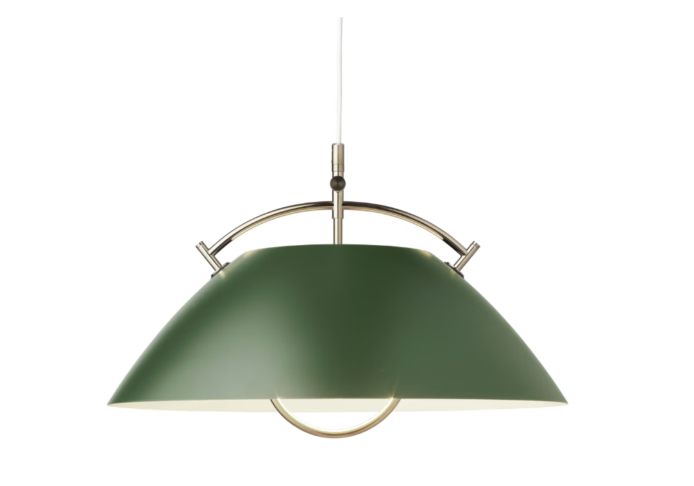 HJW37 The Pendant von Hans J. Wegner für Carl Hansen & Søn entworfen, ist eine Pendelleuchte mit lackiertem Stahlschirm und Metallrahmen aus vergoldetem oder vernickeltem Stahl. Auch mit Auf-/Ab-Bewegung erhältlich.