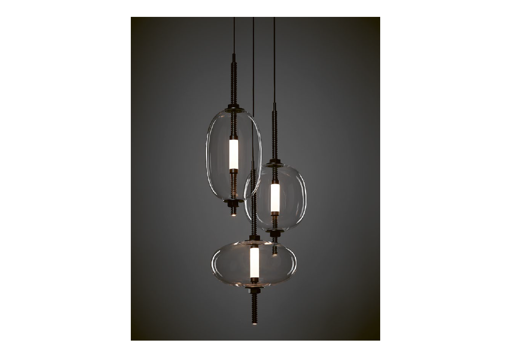 Under Pressure von Boris Klimek, Lenka Damova für Brokis entworfen, ist eine Hängeleuchte aus geblasenem Glas, erhältlich in verschiedenen Ausführungen. Leuchtenkörper und Deckenrosette bestehen aus gebürstetem, lackiertem Metall.