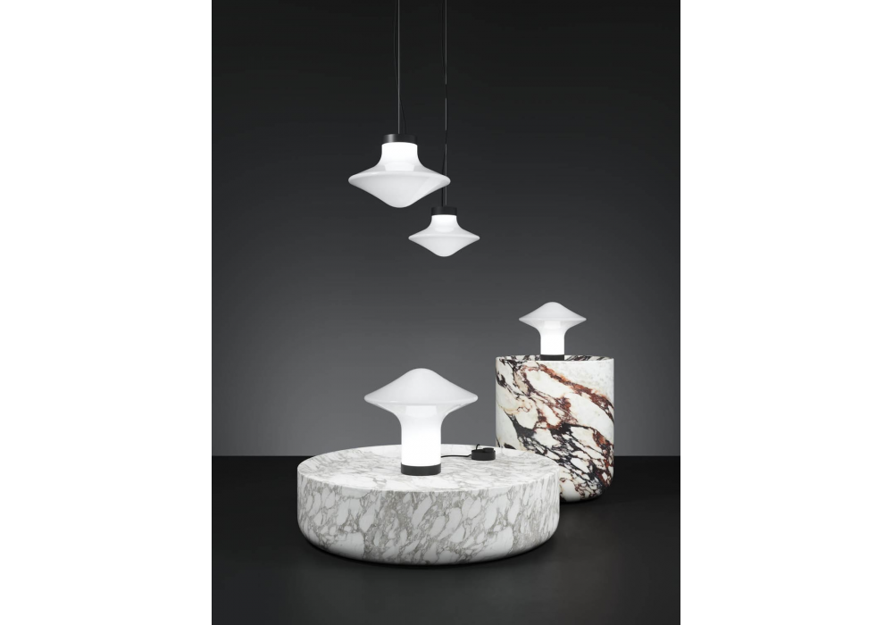 Trottola von Federico Peri für Brokis entworfen, ist eine Hängeleuchte aus Glas mit Glanzeffekt in verschiedenen Ausführungen. Leuchtenkörper und Deckenrosette bestehen aus Metall. Das Kabel besteht aus Textilmaterial. Als Lichtquelle dient eine dimmbare LED in verschiedenen Ausführungen.