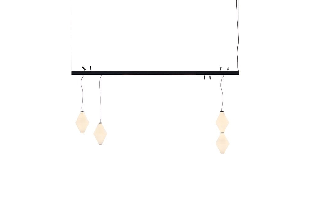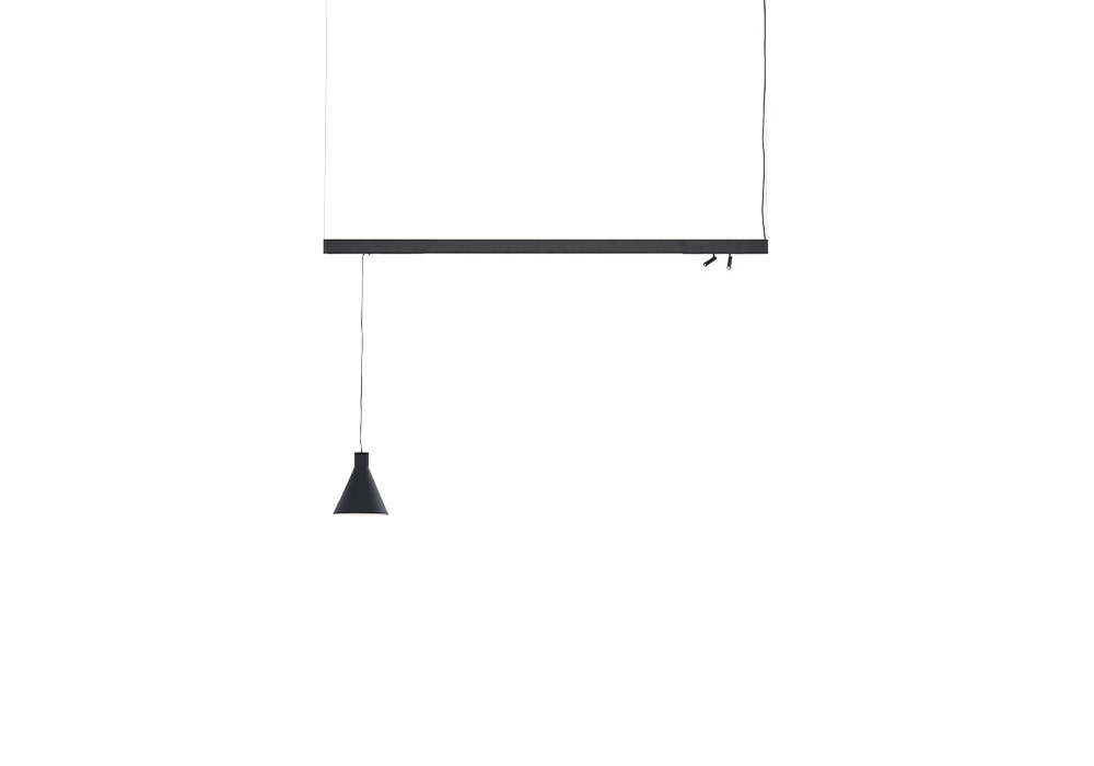 Linear Light System von C.R.S. De Padova entworfen, ist ein elektrifiziertes Schienenbeleuchtungssystem mit doppelter Lichtemission, konfigurierbar mit linearen Leuchten, verstellbaren Strahlern und dekorativen Pendelleuchten. Hergestellt aus mattschwarz lackiertem Aluminium mit Soft-Touch-Lackierung, mit passender Deckenrosette und integriertem Netzteil (24 V Ausgang). Steuerung und Dimmung über PUSH oder DALI. Die Lichtquellen an den oberen und unteren Profilen lassen sich unabhängig voneinander steuern und bieten so maximale Gestaltungsfreiheit.