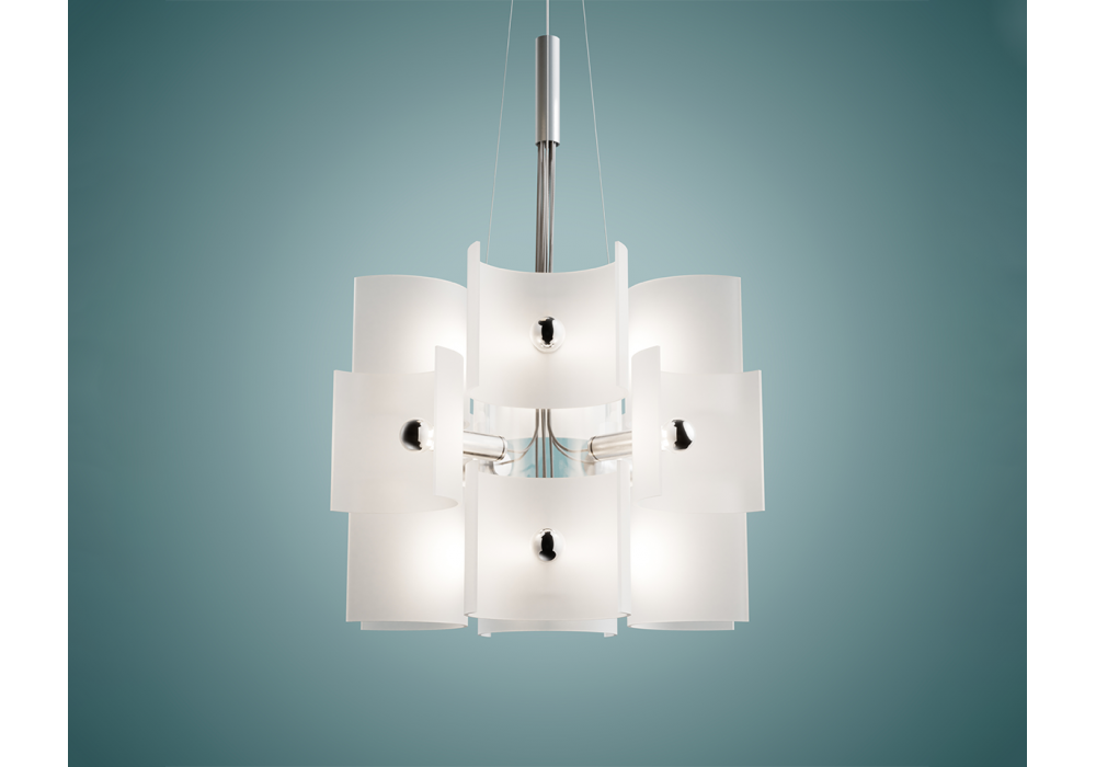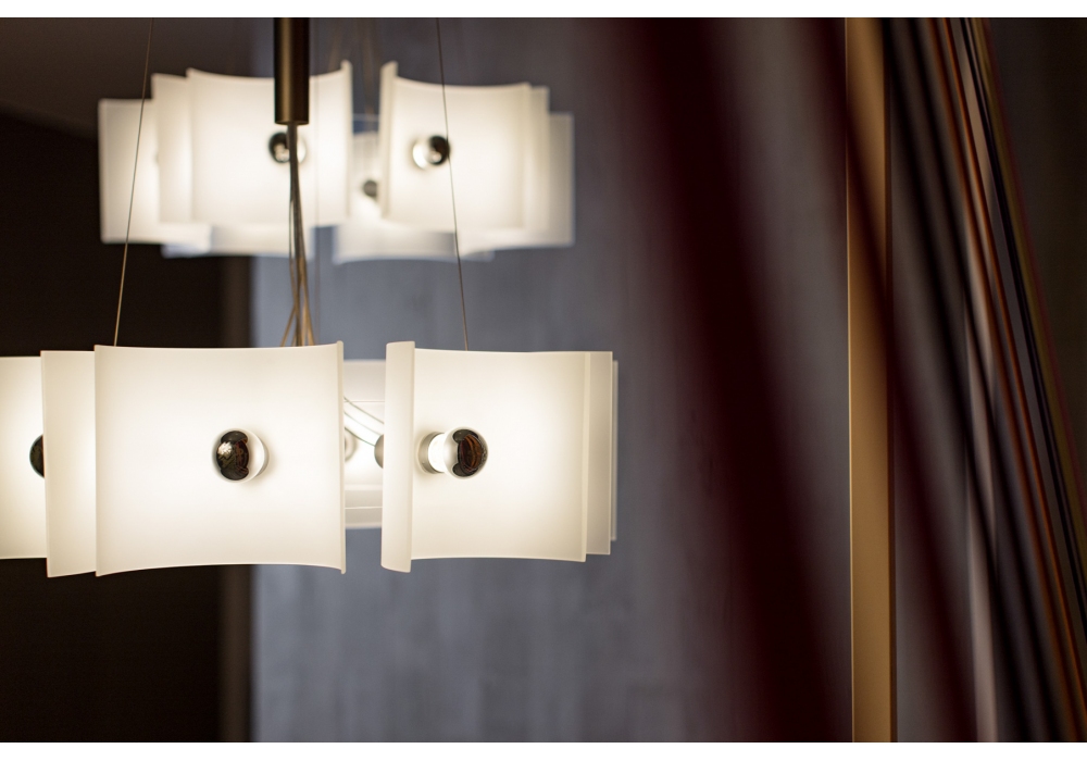 Etoile von Dordoni Studio für Foscarini entworfen, ist eine Pendelleuchte, die von den neu interpretierten Murano-Kronleuchtern inspiriert ist. Die aus säuregeätztem, mundgeblasenem Glas und Pyrex gefertigten Glühbirnen sind in der Mitte jedes Diffusors verankert. Die silberne Frontoberfläche lenkt das Licht auf das Glas, sodass es absorbiert und neu verteilt wird.