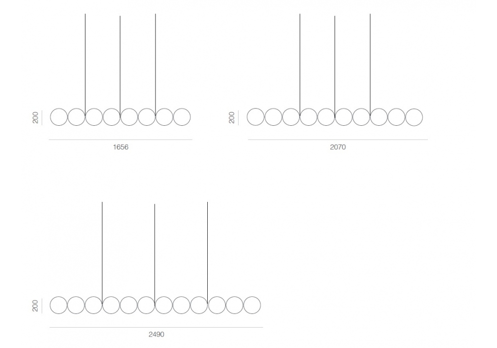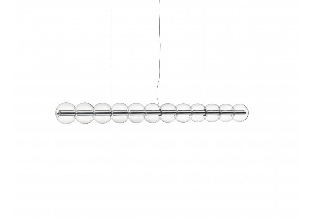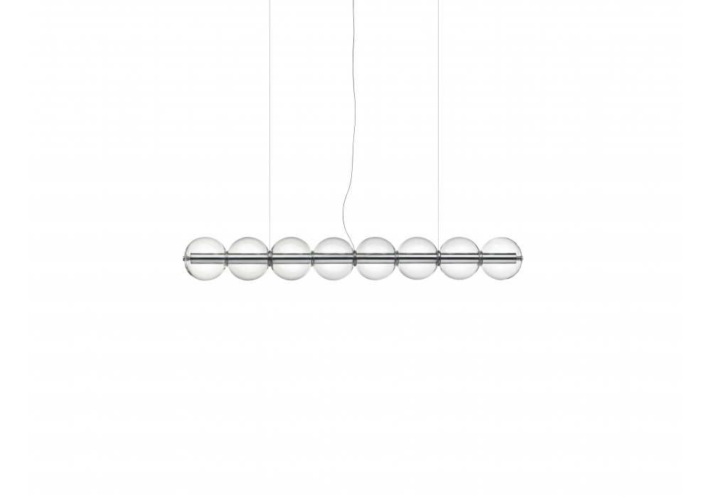 Luce Sferica von Ronan Bouroullec für Flos entworfen, ist eine Hängeleuchte mit einer Struktur aus poliertem extrudiertem Aluminium und kugelförmigen Modulen aus transparentem Borosilikatglas. Das Netzteil ist in die Rosette integriert. Über die Touch-Bedientaste an einem Ende des Produkts können drei verschiedene Modi gesteuert werden.