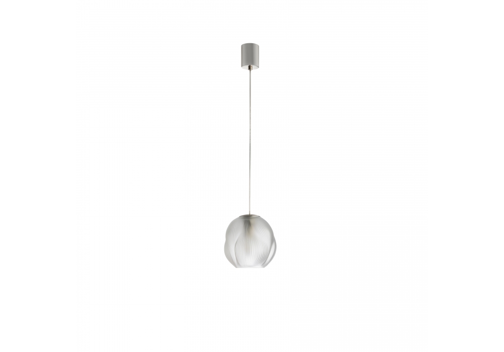Alizé von René Lalique für Lalique entworfen, ist eine Hängeleuchte mit einem transparenten Kristalldiffusor und einer satinierten Metallstruktur.