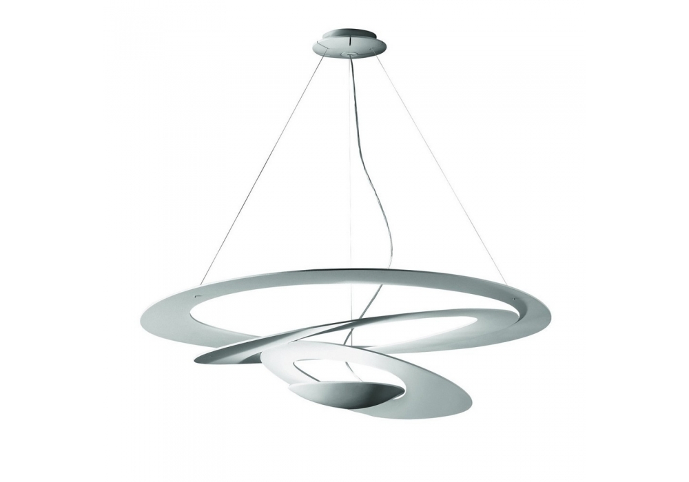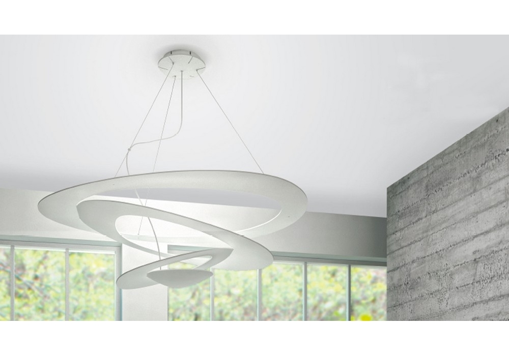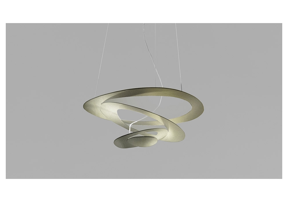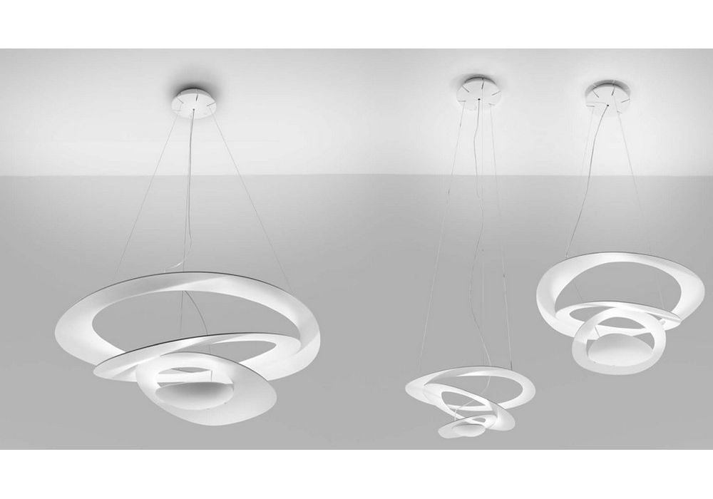 Pirce Micro Led von Giuseppe Maurizio Scutellà für Artemide entworfen ist eine kreisförmige Hängeleuchte, die durch eine Scheibe strukturiert ist, die sich ausdehnt und eine versetzte Spiralform erzeugt. Die verwendete Lichtquelle ist vom Typ LED mit Push-Dimmbarkeitssystem. Pirce Micro Led ist in verschiedenen Ausführungen erhältlich.
