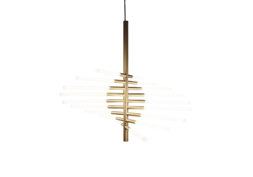 Bianca Twist von Dainelli Studio für Contardi entworfen, ist eine Hängeleuchte mit leuchtenden Armen in Gold- oder Bronzeoptik. Die modulare Struktur besteht aus Elementen, die kabellos durch Kontakt miteinander verbunden sind und den Strom über integrierte Schaltkreise leiten. Die „Twist“-Version zeichnet sich durch eine spiralförmige Anordnung aus, die Leichtigkeit und Bewegung unterstreicht. Ausgestattet mit speziell angefertigten LED-Leuchtmitteln für warmes Licht (2700 K) ist sie dimmbar und mit verschiedenen Steuerungssystemen kompatibel.