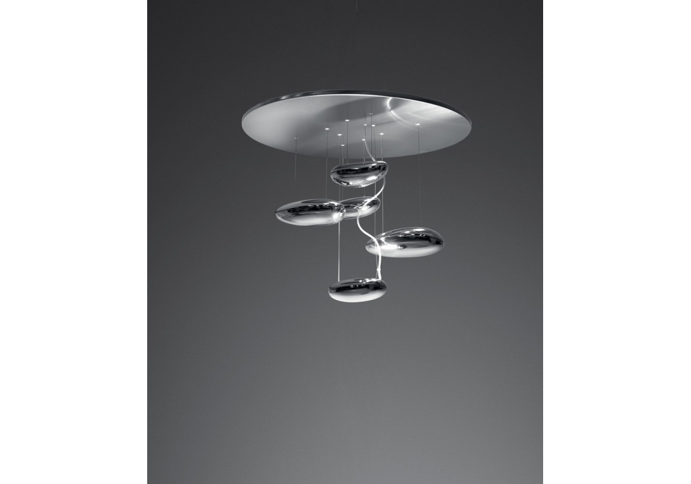 Mercury Mini von Ross Lovegrove für Artemide entworfen ist eine Hängeleuchte mit Rosette und kreisförmiger Aluminium-Verankerungsplatte. Die Diffusoren sind schwebende Kieselsteine mit LED-Lichtquellen mit Push-Dimmbarkeitssystem. Mercury Mini ist in verschiedenen Lichtquellenversionen erhältlich.