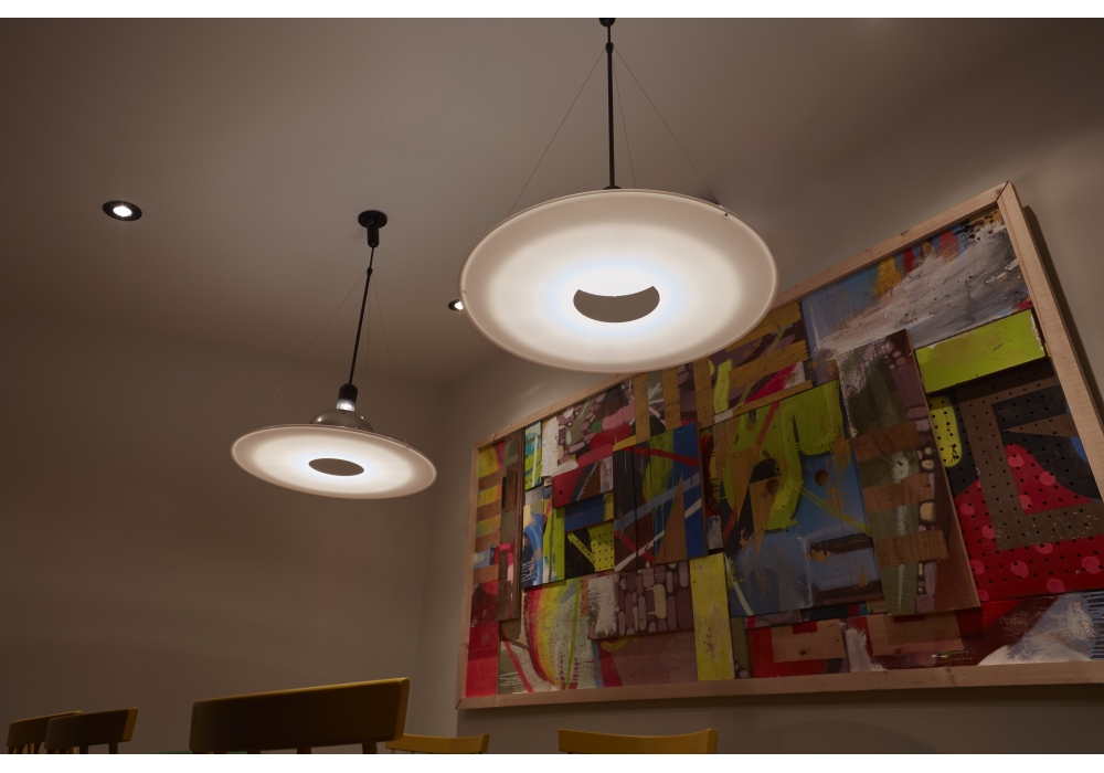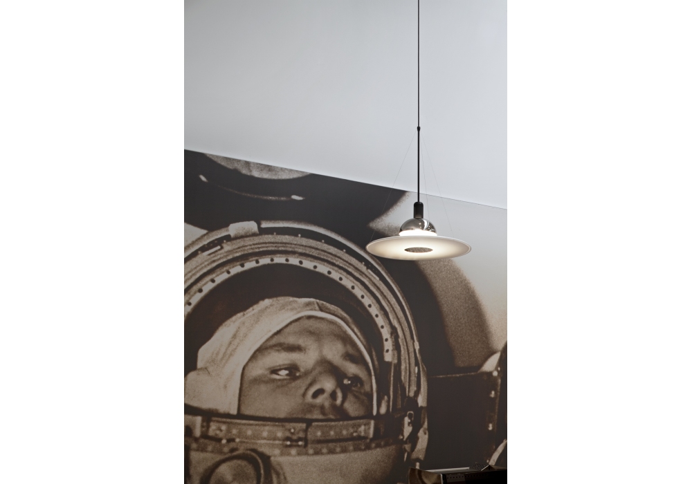 Frisbi von Achille Castiglioni für Flos entworfen, ist eine Hängeleuchte mit direktem, diffusem und reflektiertem Licht. Die Diffusorplatte aus spritzgegossenem Opal-Polymethylmethacrylat (PMMA) ist durch drei dünne Drähte aus harmonischem Stahl mit dem Leuchtenkörper verbunden. Der Reflektor besteht aus gestanztem Blech, poliert, vernickelt, zaponiert und innen glänzend weiß lackiert. Wandhalterung und Rosette aus schwarzem, spritzgegossenem ABS. Ferngesteuert regulierbar (Dimmer nicht im Lieferumfang enthalten). Leuchtmittel nicht im Lieferumfang enthalten.