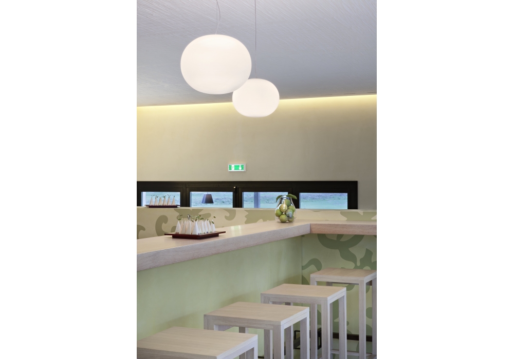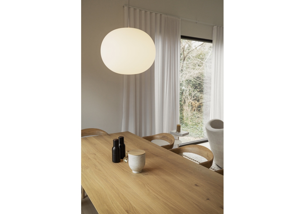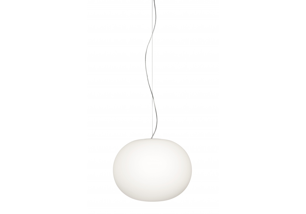 Glo-Ball S2 von Jasper Morrison für Flos entworfen, ist eine Hängeleuchte mit diffusem Licht. Diffusor aus mundgeblasenem Opalglas mit säuregeätzter Oberfläche. Diffusorhalterung aus transparentem, spritzgegossenem Polycarbonat. Deckenrosette aus Polyamid mit 30 % Glasfaseranteil, spritzgegossen, Deckenbefestigung aus gegossenem und verzinktem Stahl. Aufhängung aus Stahl. Fernverstellbar (Dimmer nicht enthalten). Leuchtmittel nicht enthalten.