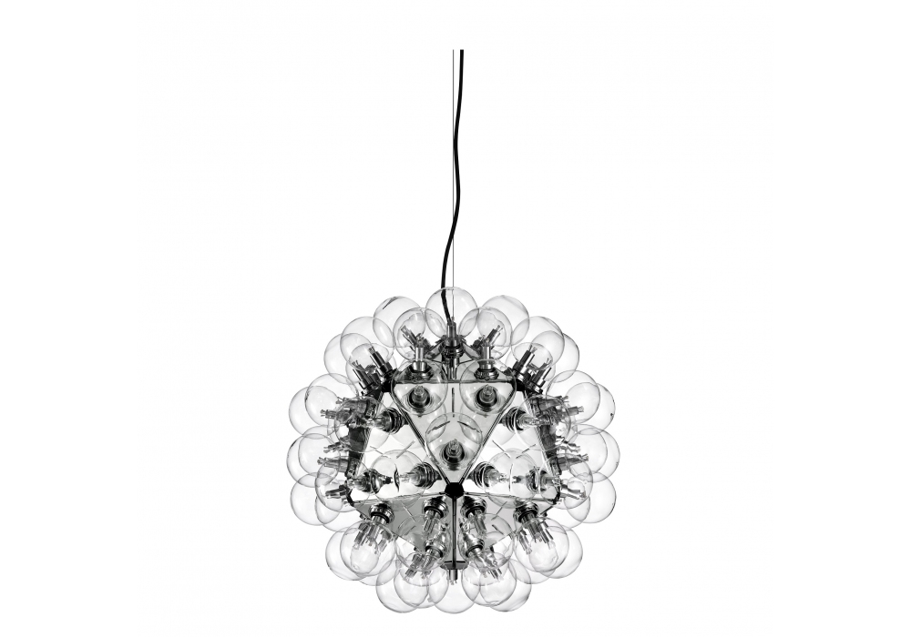Taraxacum 88 S1 von Achille & Pier Giacomo Castiglioni für Flos entworfen, ist eine Hängeleuchte mit direktem und reflektiertem Licht. Die Struktur besteht aus 20 Dreiecken aus poliertem, bedrucktem Aluminium. 60 transparente Globolux-Glühbirnen sind um die Struktur herum angeordnet. Deckenbefestigung und Rosette aus Stahl. Fernverstellbar (Dimmer nicht im Lieferumfang enthalten). Leuchtmittel im Lieferumfang enthalten.