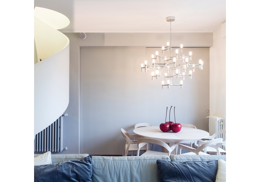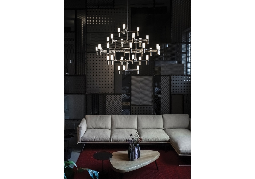 Crown Major von Jehs + Laub für Nemo entworfen, ist ein Leuchter mit modularer Struktur aus Aluminium-Druckguss. Die Diffusoren sind aus sandgestrahltem Glas und nehmen eine dimmbare LED- oder Halogenlichtquelle auf. Crown Major ist in verschiedenen Ausführungen erhältlich.