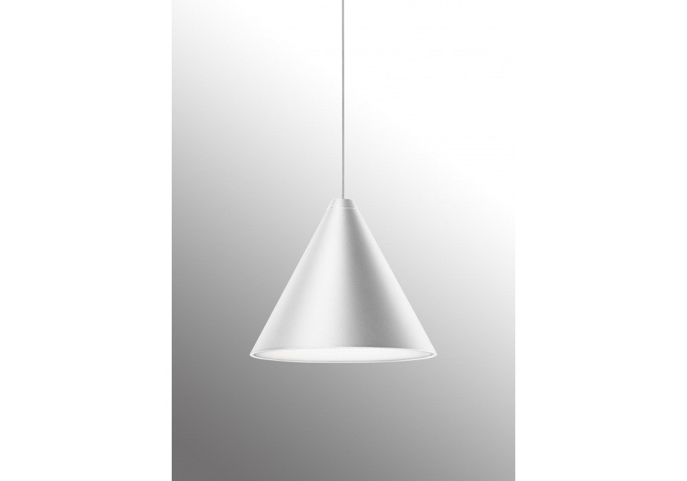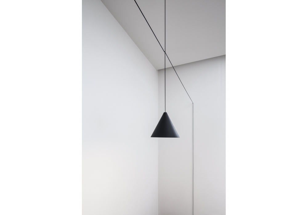 String Light Sphere von Michael Anastassiades für Flos entworfen ist eine Hängeleuchte mit einer Struktur aus konischem Aluminium, das in verschiedenen Ausführungen lackiert ist. Der Diffusor besteht aus weißem Polycarbonat und nimmt eine LED-Lichtquelle auf, die in der Standard-Dimmer- oder Casambi-Dimmer-Version (einstellbar über die Anwendung) erhältlich ist.