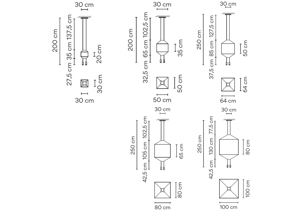 | Abmessungen | 100 x 100 x H 130 cm; 80 x 80 x H 105 cm; 64 x 64 x H 85 cm; 50 x 50 x H 65 cm; 30 x 30 x H 200 cm. |