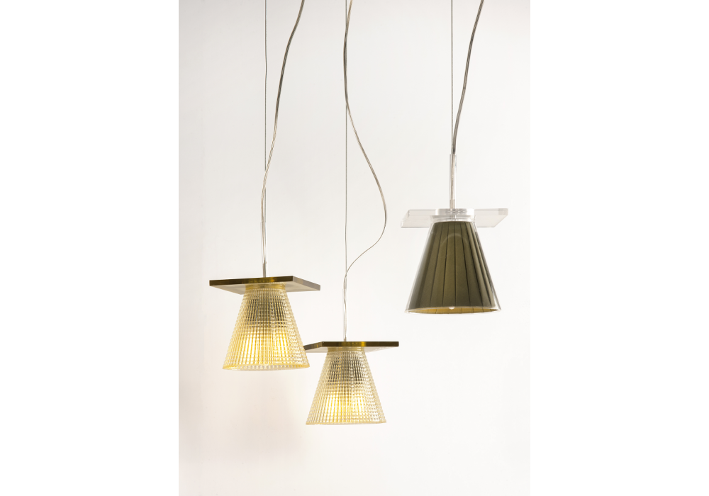 Light-Air von Eugeni Quitllet für Kartell entworfen, ist eine Hängeleuchte mit Struktur aus transparentem thermoplastischem Technopolymer und mit Stoff bezogenem Diffusor.