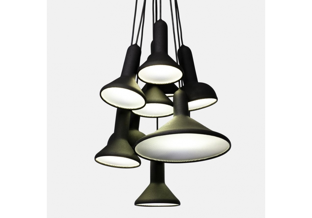 Torch Light Bunch, von Sylvain Willenz für Established & Sons entworfen, ist eine Pendelleuchte, die aus Lampen besteht, die in Gruppen von 5, 10 und 20 Leuchten unterteilt sind. Die Struktur ist aus PVC und der Lampenschirm mit diamantgeflochtenem Diffusor. Erhältlich mit Kabel in verschiedenen Ausführungen.