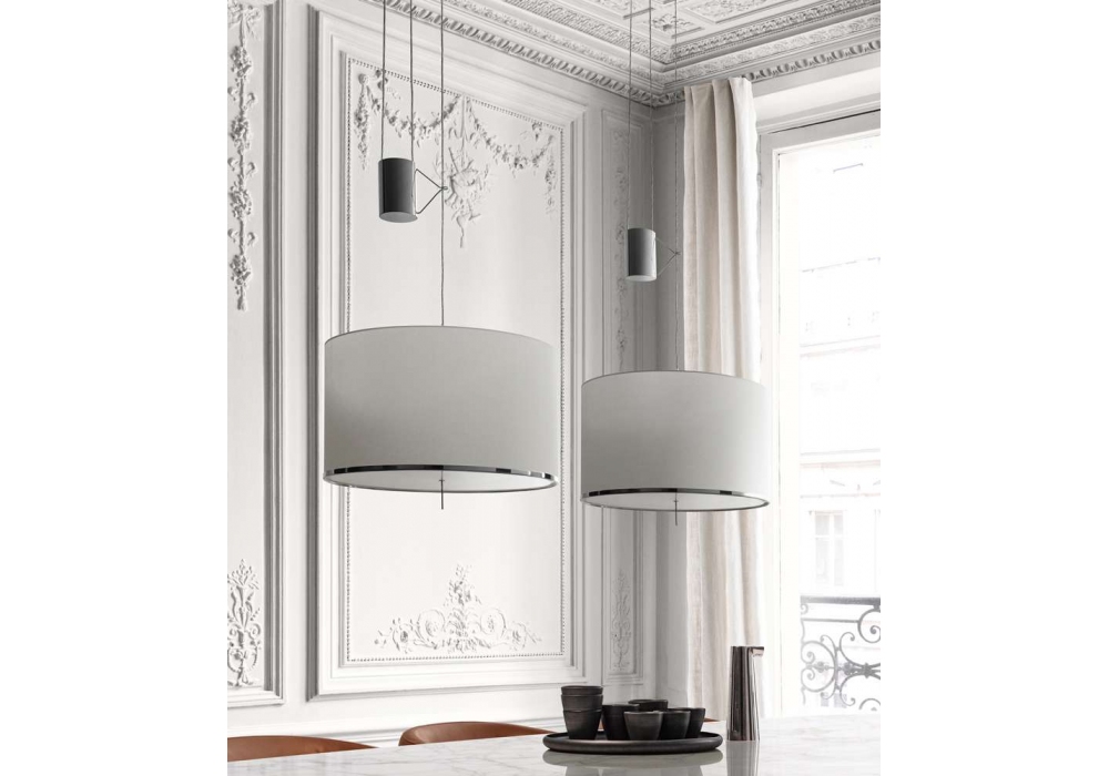 Leukon von Antonio Citterio für Maxalto entworfen ist eine runden Pendelleuchte, die in zwei Größen erhältlich ist. Lampenschirm aus beigem, dunkelbraunem oder weißem Stoff und unterer Schirm aus säuregeätztem Glas. Die Strukturen sind aus bronziertem oder poliertem Chrommetall. Höhenverstellbar.