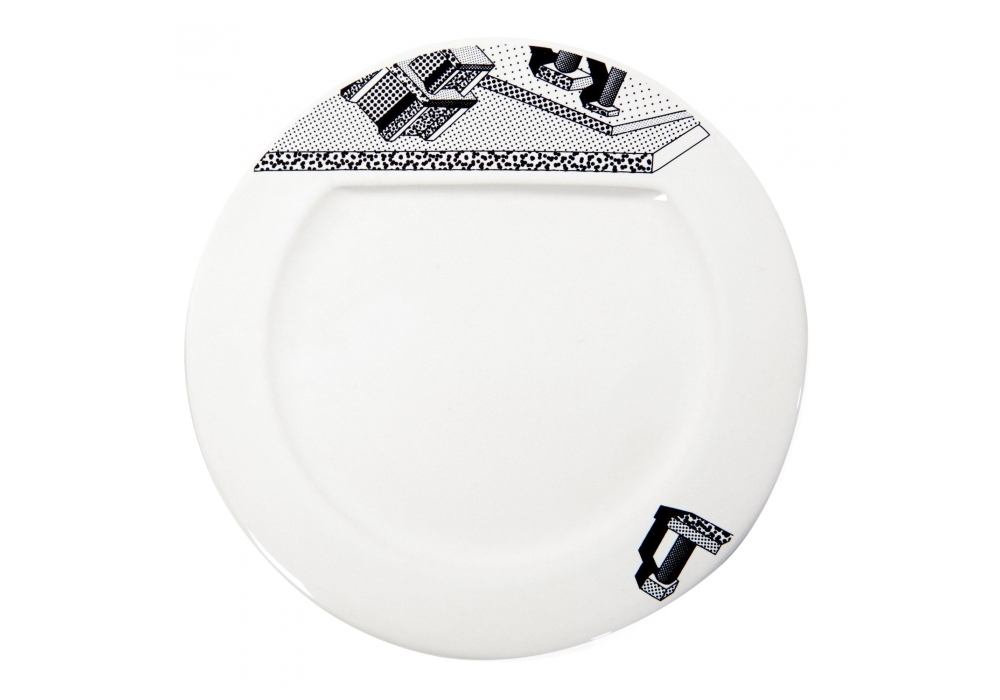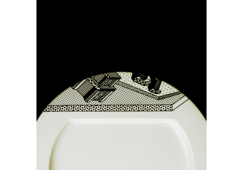 Indivia von Ettore Sottsass für Memphis Milano entworfen, ist ein weißer Obstteller aus Keramik mit Dekorationen.