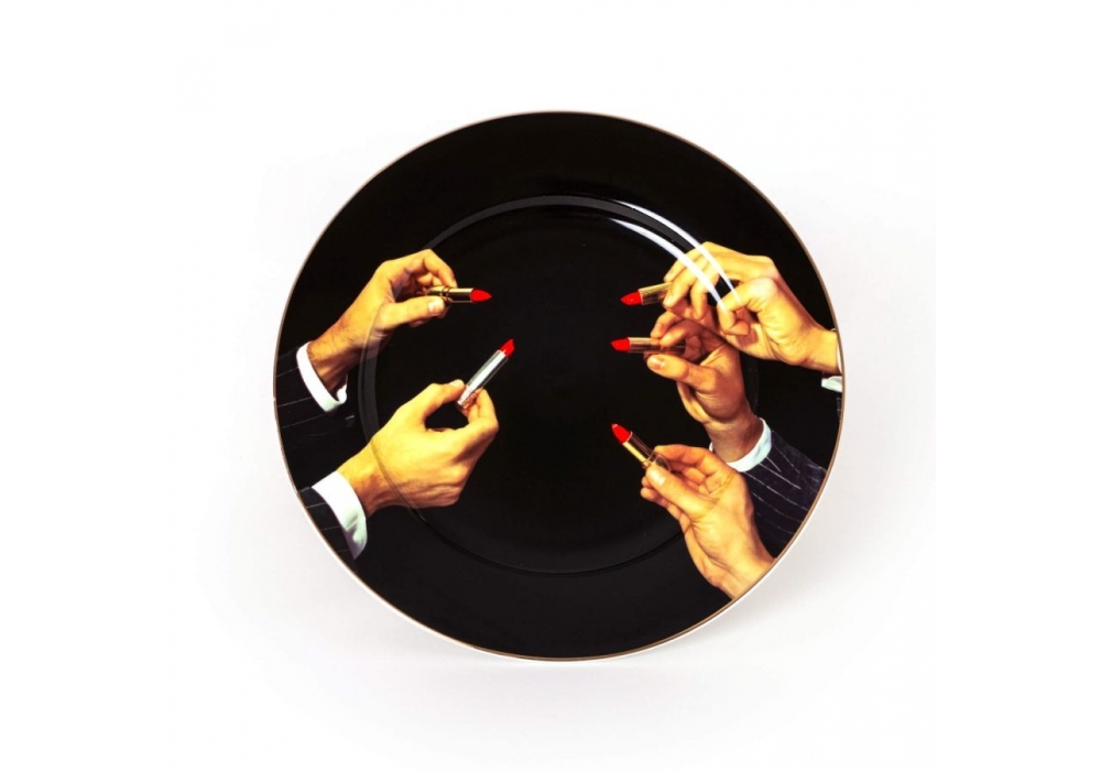 Lipsticks Black entworfen vom Toiletpaper Magazine für Seletti ist ein schwarzer Porzellanteller mit goldenem Rand der mit verschiedenen Figuren und Pigmenten verziert ist.