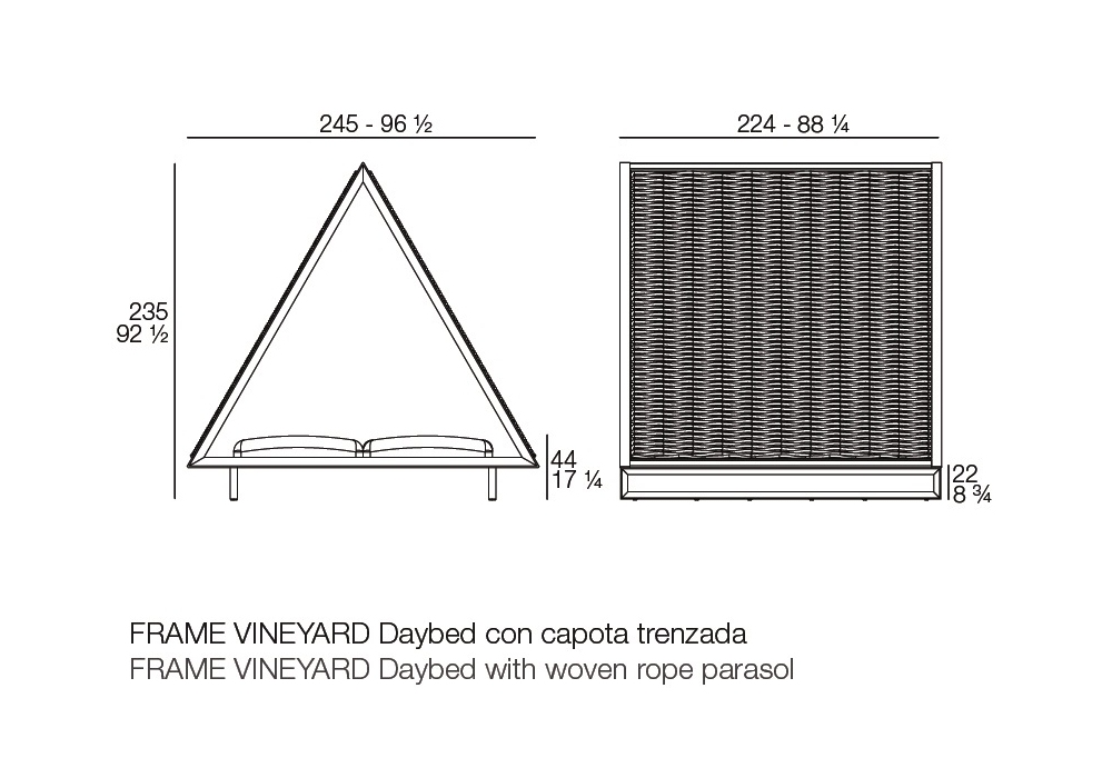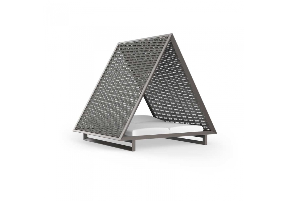 Vineyard Rope von Ramón Esteve für Vondom entworfen, ist ein Daybed mit einem Satteldach aus Seil, einer Aluminiumstruktur und einer doppelt liegenden Matratze, die den Komfort und die Vielseitigkeit erhöht. Erhältlich mit weißer oder RGBW-LED-Leuchte mit Kabel oder Akku.