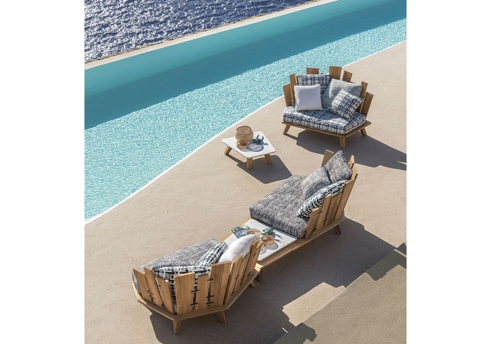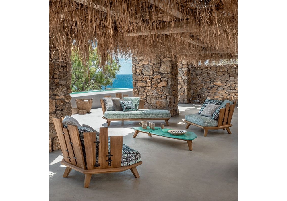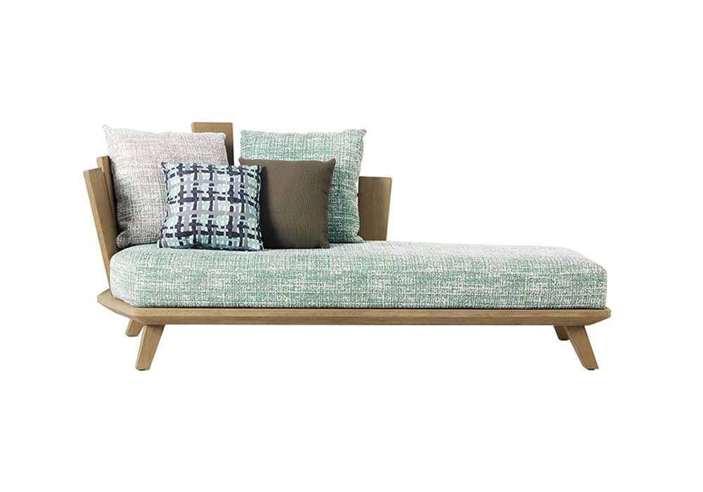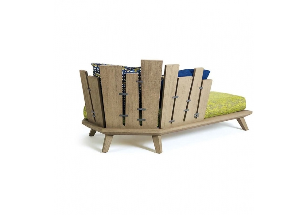 Rafael, von Paola Navone für Ethimo entworfen, ist ein Daybed mit Teakholzkorpus und Stoffkissen. Rafael ist in verschiedenen Ausführungen erhältlich.