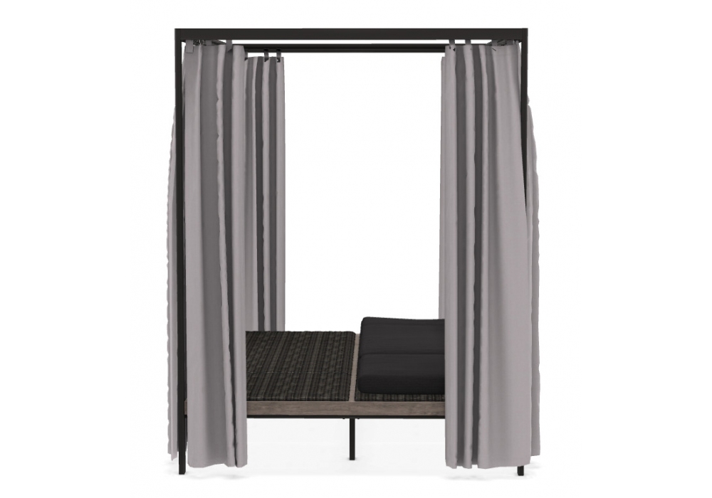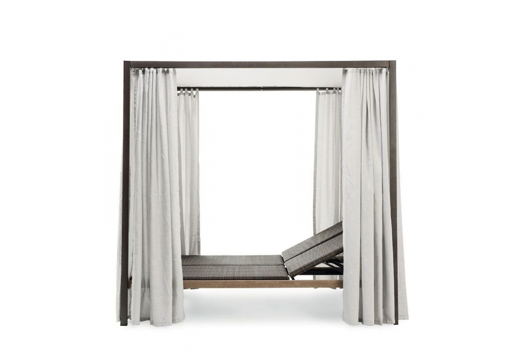 Allaperto Mountain, entworfen von Matteo Thun, Antonio Rodriguez für Ethimo, ist ein Tagesbett mit Struktur aus lackiertem Metall und gebeiztem Teakholz, das mit Etwick-Fasern bedeckt ist. Die Kissen sind aus wasserabweisendem Esperesso-Acrylstoff. Allaperto Mountain ist in verschiedenen Ausführungen erhältlich.