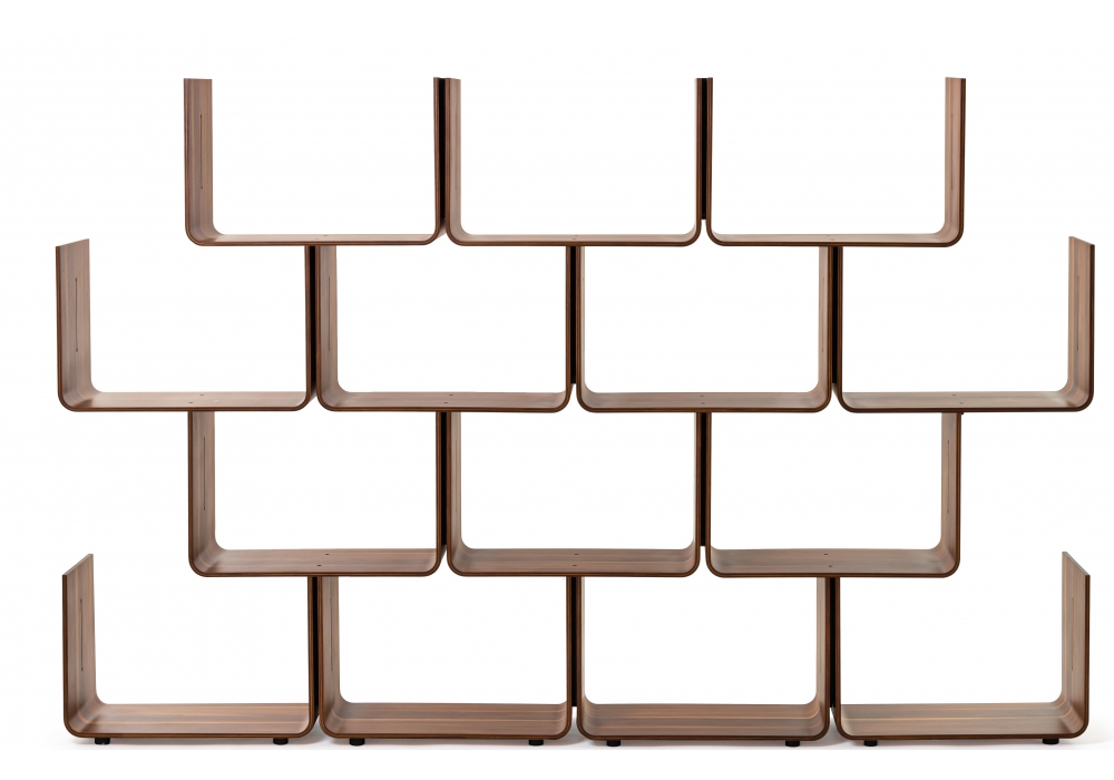 Elysée von Pierre Paulin für Magis entworfen, ist ein modulares, stapelbares und kombinierbares Bücherregal aus Ahorn-, Eichen- oder Walnusssperrholz. Verfügbar in verschiedenen Ausführungen und Zusammensetzungen. T-Verbindungen aus weißem ABS für die Module aus natürlichem Ahornsperrholz und aus schwarzem ABS für alle anderen Ausführungen.