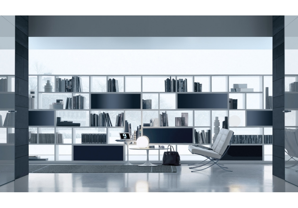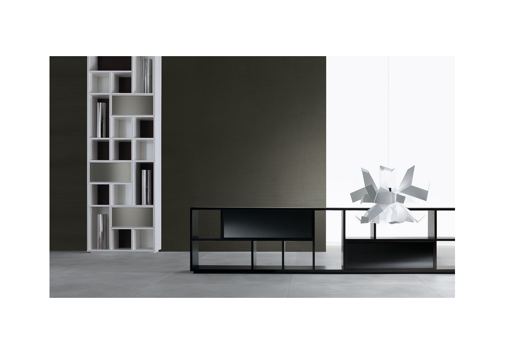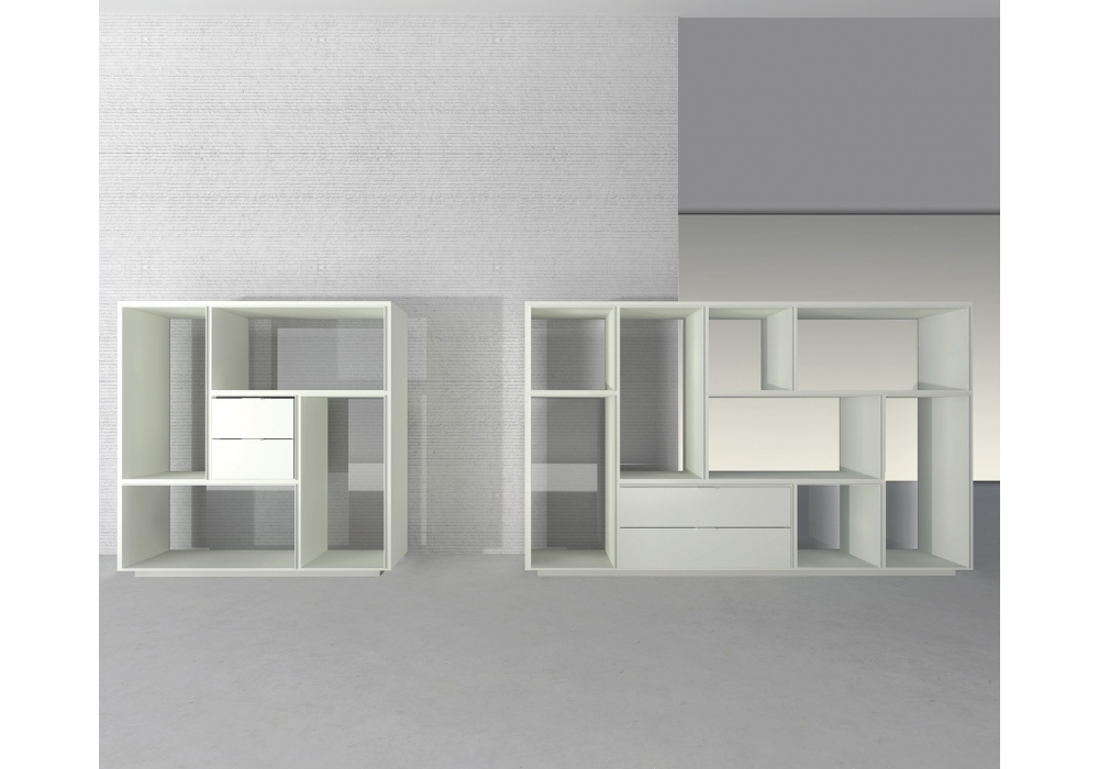 Opus von Giuseppe Bavuso für Rimadesio entworfen, ist ein modulares Regalsystem, mit der freien Kombination des Quadrats und des Rechtecks als System Elemente. Die Einfachheit dieses Konzepts bietet eine außerordentliche Planungsvielseitigkeit sowie die Möglichkeit auch sehr große Anlagen in absoluter Sicherheit bauen zu können. Die beidseitige Verwendung ermöglicht freie Erweiterungsmöglichkeiten, um Architektur der Räume definieren zu können. Von der perfekten Verbindung der Module durch Haken, in der Struktur integriert, bis zu der exklusiven Klapp-Paneelen aus Aluminium und gehärtetem Glas, mit völlig unsichtbar Scharnieren ausgeruestet. Die Rimadesio Innovation ist immer an eine Konzeption von großer Aesthetik-Strenge verbunden.