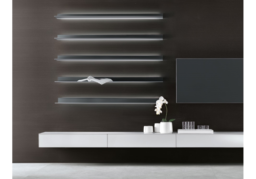 Eos von Giuseppe Bavuso für Rimadesio entworfen, ist ein System von Regalen an der Wand befestigt, mit einem integriertem Beleuchtungssystem, Aluminiumrahmen und lackierte Glasplatte lackiert. Das wichtigste Merkmal des Projekts ist die einzigartige Staerke von 8 mm, Ergebnis der technologischen Forschung zur Gewährleistung absoluter Zuverlässigkeit, so dass sich die meisten der Qualitäten.