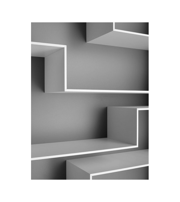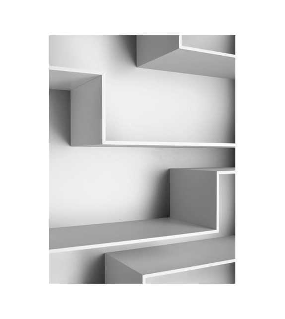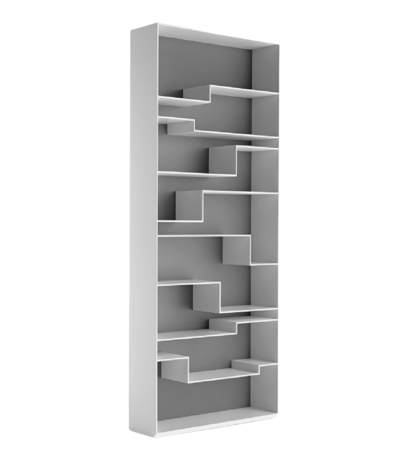 Melody, von Neuland Industriedesign für MDF Italia entworfen, ist ein Bücherregal mit Seiten und Regalen aus Holzfasern mittlerer Dichte. Erhältlich in der einfarbigen Version mit geprägten, mattweiß lackierten Oberflächen und Regalen oder mit kontrastierender, mittelgrau lackierter Rückseite.
