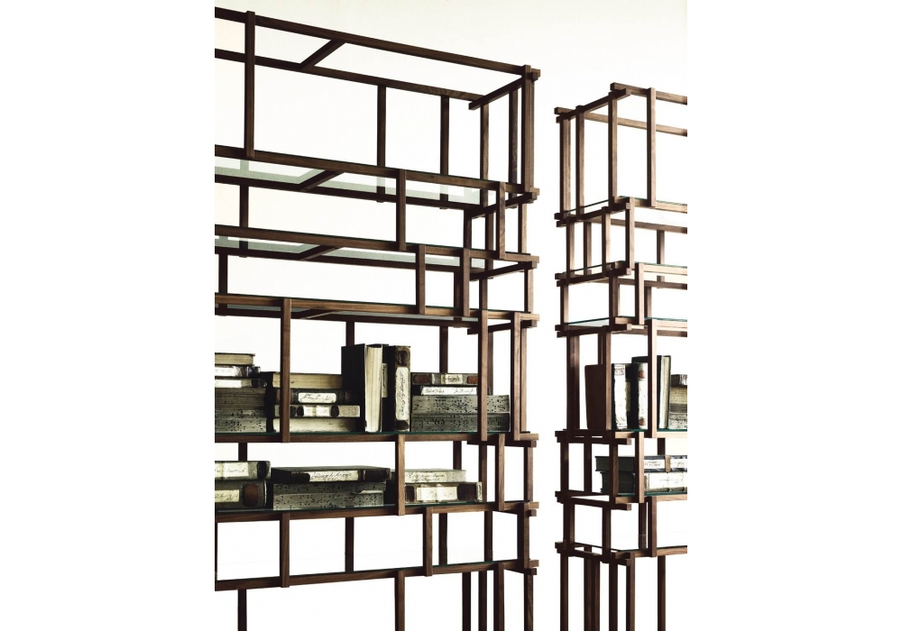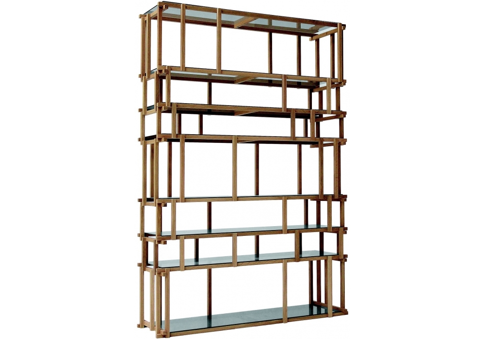 Off Cut designed by Nathan Yong for Living Divani is a bookcase designed by assembling interlocking laths of solid wood, made from off-cuts of other pieces of furniture. Bookshelf in solid wood, natural oak or American walnut, made of splints of various sizes, thickness 20x20mm assembled together. 6 shelves in clear tempered glass 6mm thick or in wood 10mm thick; the base shelf, with set in stabilizer weights, is always in wood.