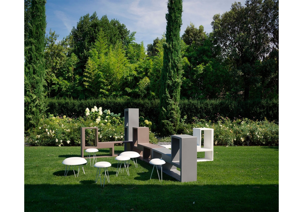 Urban von Claudio Bellini für Casamania & Horm entworfen, ist ein L-förmiges Modul aus rotationsgeformtem Polyethylen, das kombiniert und gestapelt werden kann. In jede Richtung einsetzbar, frei von Zwängen und Haken. Jedes Modul wird mit einem transparenten Kunststoffband zur eventuellen Blockierung zwischen Modul und Modul geliefert.