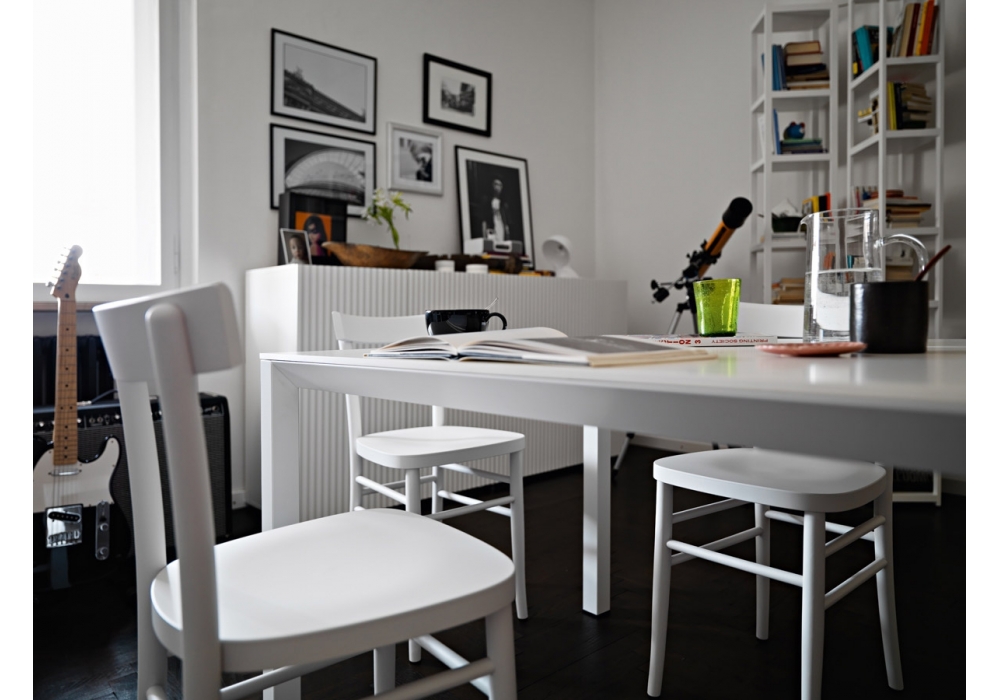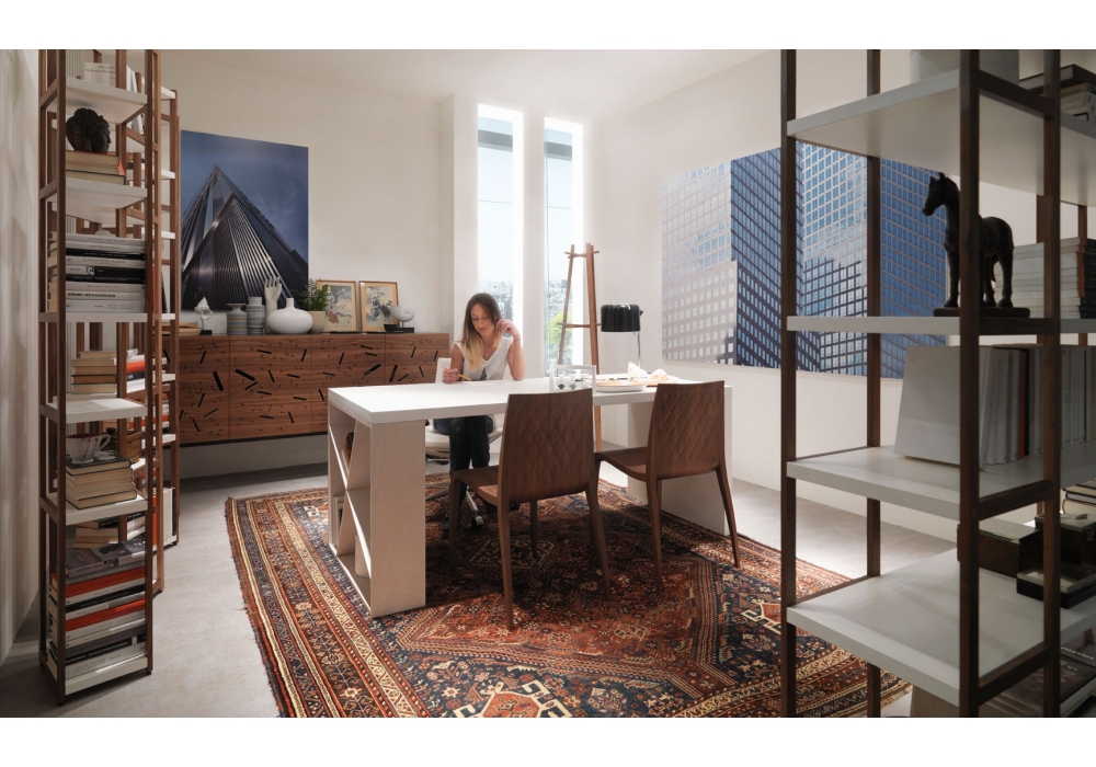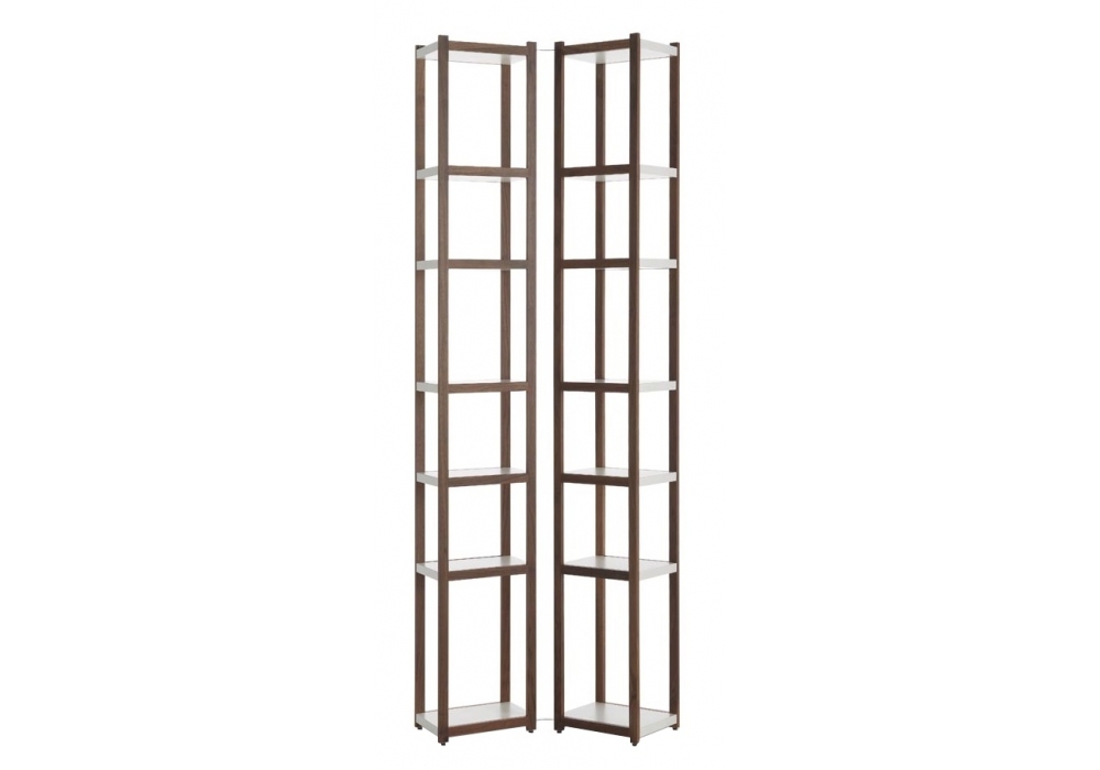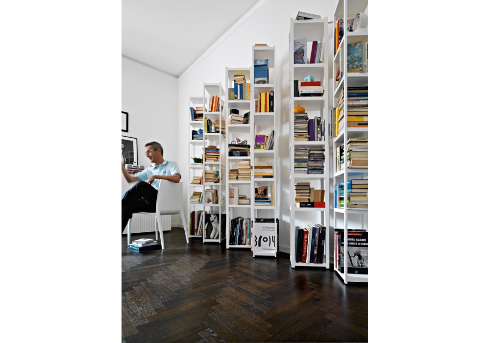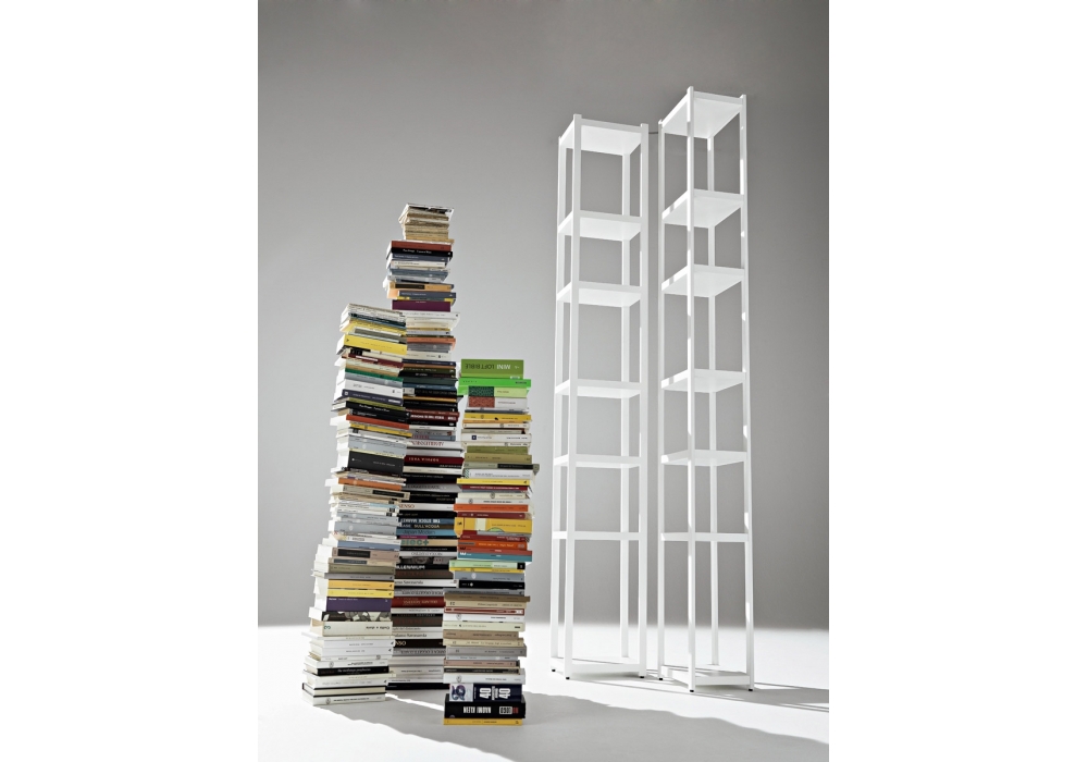 Singles von Carlo Cumini für Casamania & Horm entworfen, ist ein Bücherregal bestehend aus zwei Säulen mit Seiten aus schwarzem Walnussholz oder weiß lackierter Buche und festen Regalen aus weiß lackiertem MDF. Die die beiden Säulen verbindende Halterung besteht aus Aluminium und ist im Winkel von 60, 90 oder 120 Grad verstellbar.