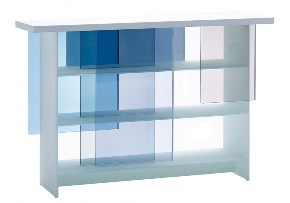 Layers designed by Nendo for Glas Italia is a bookcase realized in extralight matt white crystal. This coloured glass technique which involves inserting coloured films between two sheets of glass, and applying heat to them is the expertise of Glas Italia. he doors are available in two tone of colours: warm (orange, red, brown) and cool (light blue, grey, violet).