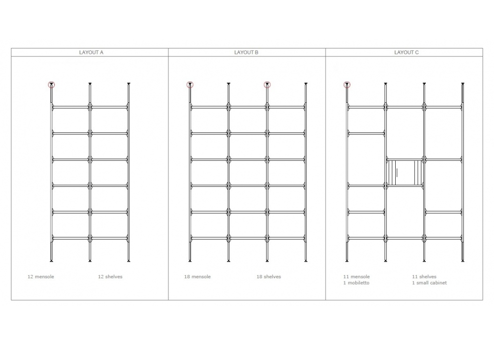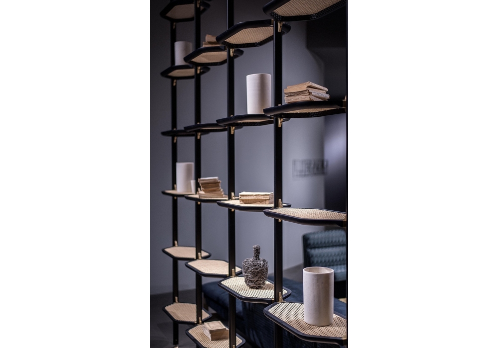 Libelle von Pietro Russo für Baxter entworfen, ist ein Modulares Bücherregal mit tragendem Aufbau in mattschwarz lackiertem Metall, befestigt an Decke und Boden durch Satin-Messing-Druckstifte. Regalstützen aus satiniertem Messing. Regale mit Gestell aus schwarzgefärbtem Ahorn mit Innenseite aus Rohr- oder Lederbezug.