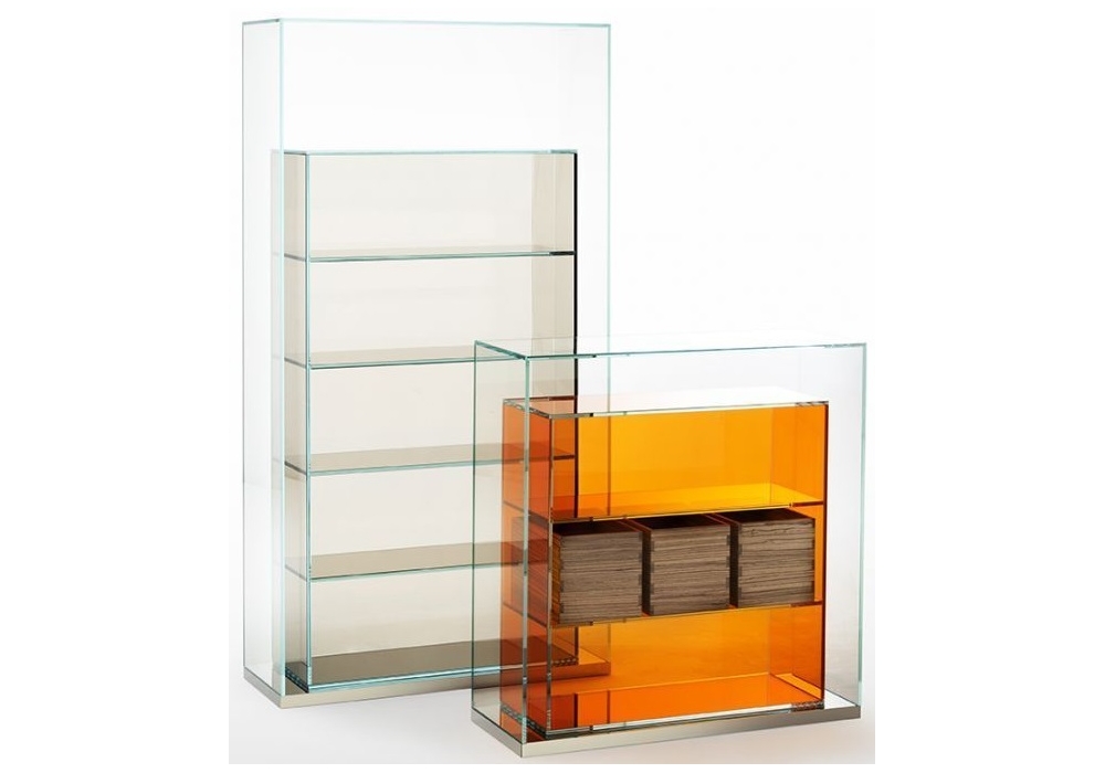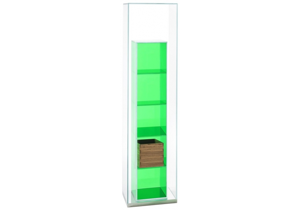 Boxinbox von Philippe Starck für Glas Italia entworfen ist ein Aufbewahrungselement aus geschichtetem und heißversiegeltem Extralight-Glas auf einem Sockel aus hochglanzpoliertem Edelstahl. Ein im 45°-Winkel verklebtes Volumen aus transparentem Extralight-Glas umschließt und wertet ein zweites Element mit Aufbewahrungsfunktion auf, das in farbigem transparentem Glas erhältlich ist. Es können Aufbewahrungsboxen aus Zebranoholz mit Schwalbenschwanzverbindung eingesetzt werden.
