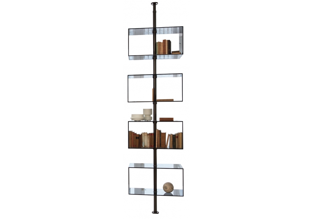 Domino von T. Colzani für Porada entworfen, ist ein modulares Bücherregal mit einer Struktur aus Bronzorometall und drehbaren Behältern aus transparentem oder geräuchertem Glas. Erhältlich in 2 Versionen: an der Wand oder an der Decke befestigt.