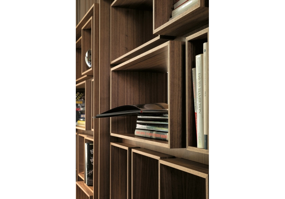 First, von Gino Carollo für Porada entworfen, ist ein Bücherregal in Canaletta Nussbaum oder Spessart Eiche und Basis aus Metall in Stahl-Finish. Perfekt für die Kombination mit dem Fancy Bücherregal.