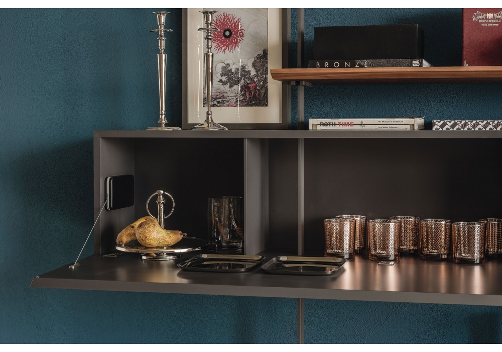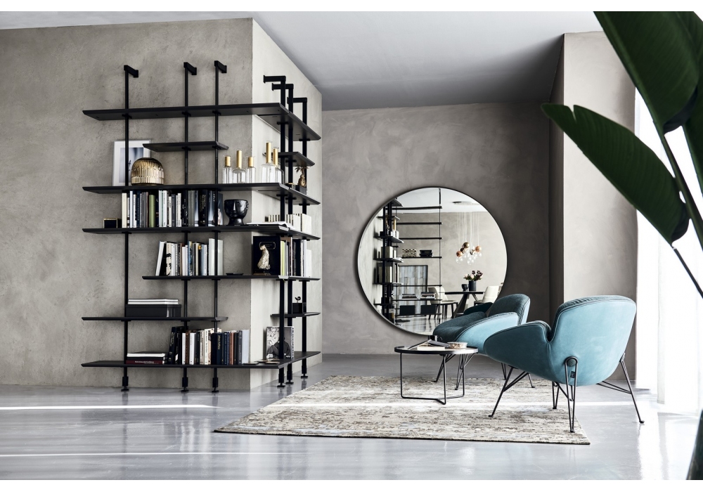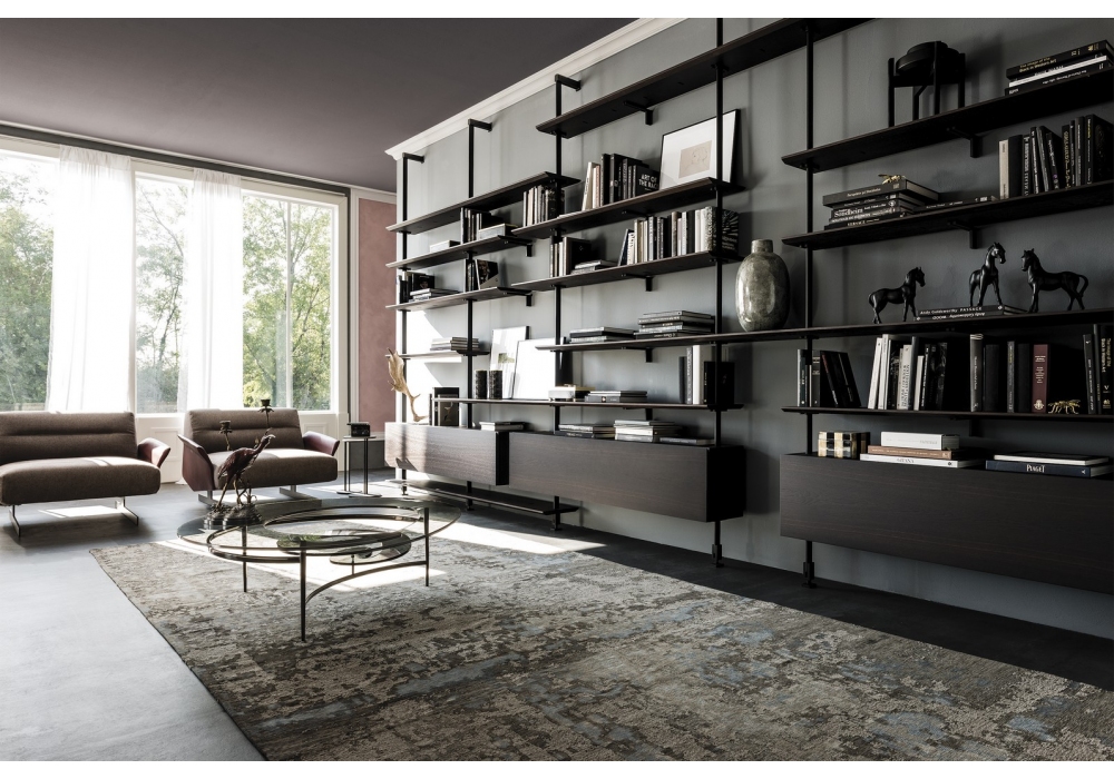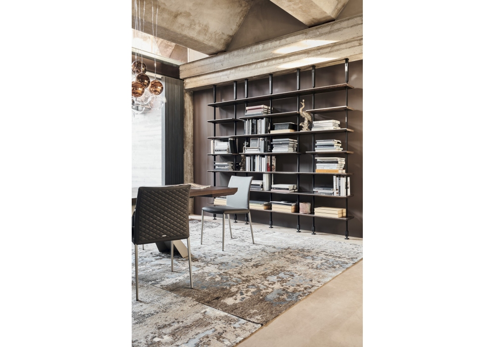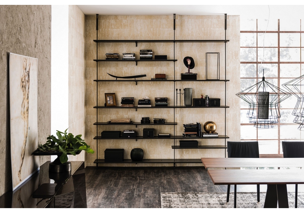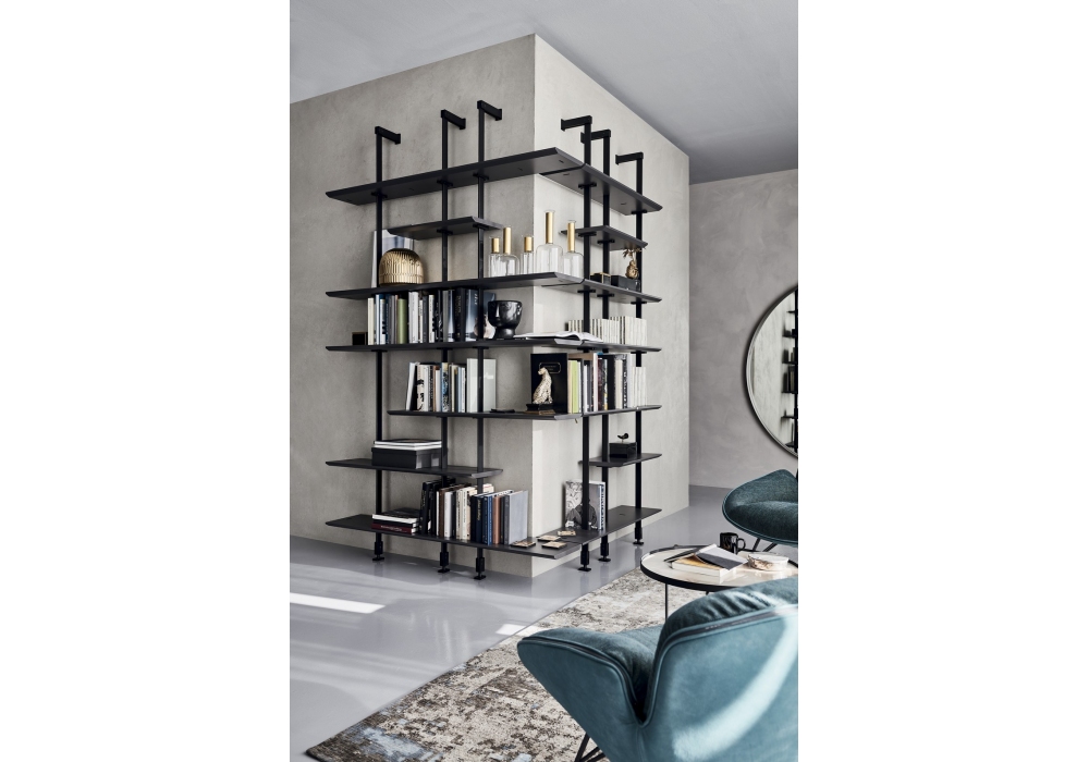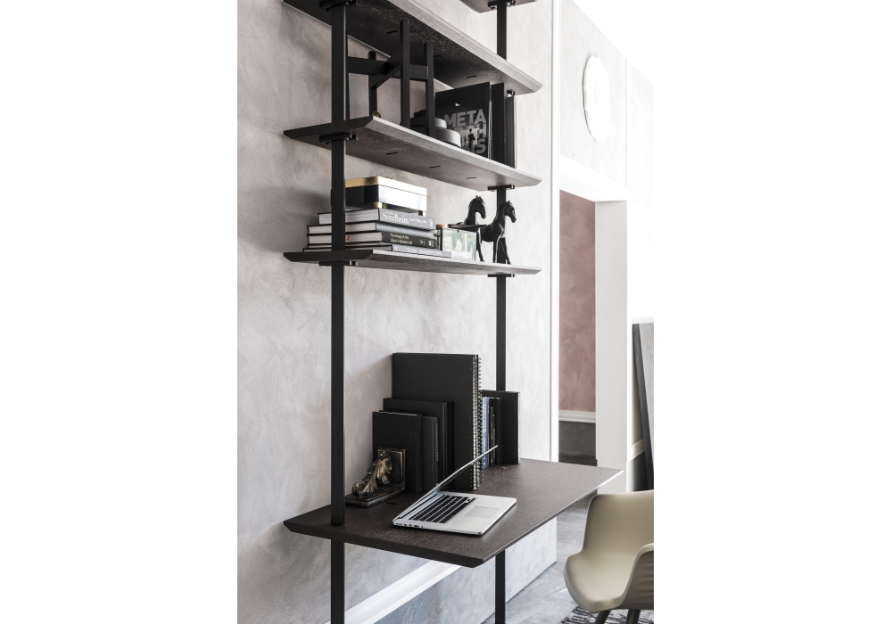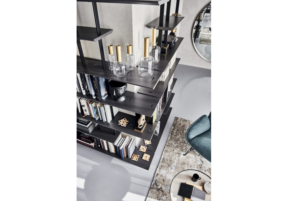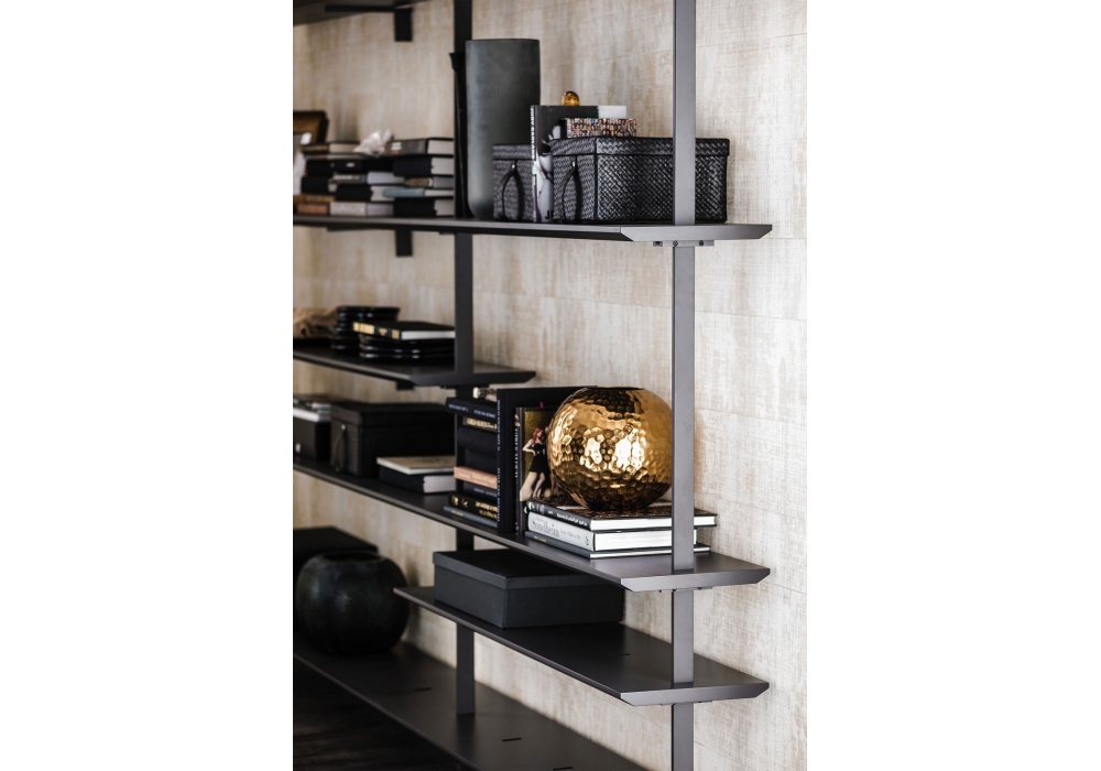 Airport, von Giorgio Cattelan für Cattelan Italia entworfen, ist ein modulares Bücherregal mit Gestell und Bügel in Stahl lackiert weiß, schwarz, Titan oder graphite gaufriert. Böden und Container in Holz lackiert weiß gaufriert oder graphite, Nussbaum Canaletto, gebürstete Bronze oder "verbrannte Eiche". Es kann an der Wand oder an der Decke befestigt werden. Verfügbar in verschiedenen Modellen.