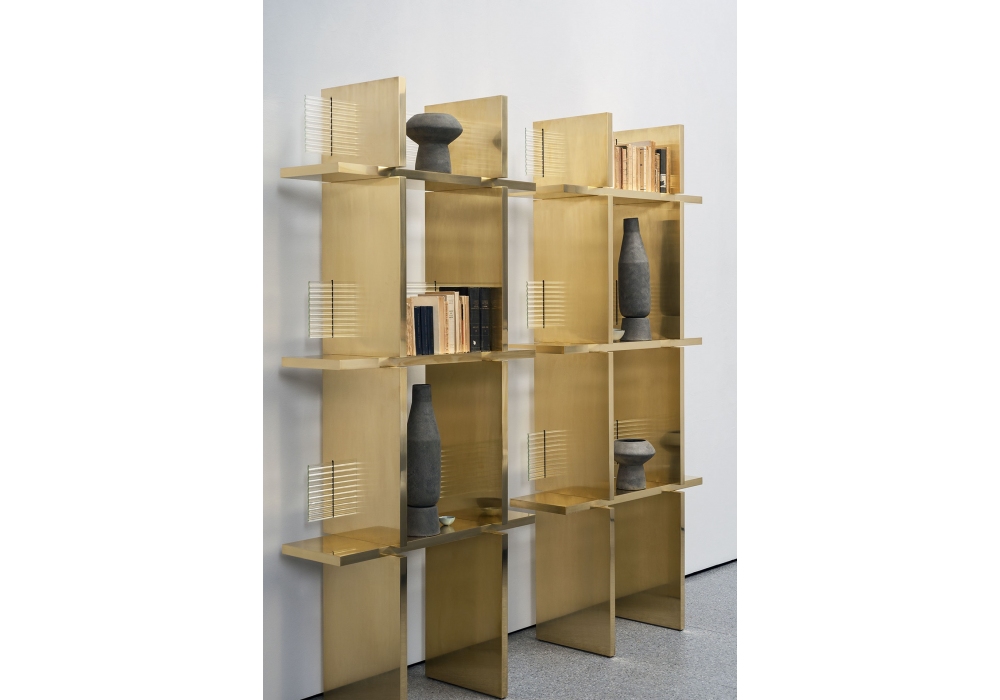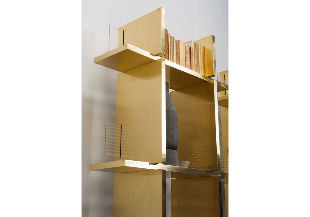 Viceversa von Draga & Aurel für Baxter entworfen, ist ein Bücherregal mit einer Struktur aus lackiertem Aluminium, die mit polierten Messingplatten bedeckt ist. Rückenbänder aus extra klarem Wellglas.