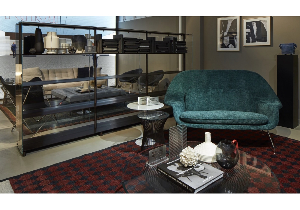 Red Baron von Piero Lissoni für Knoll entworfen, ist ein modulares Bücherregal mit einer Struktur aus anthrazitfarben lackiertem Aluminium; die Rückwand und die Seiten sind aus gehärtetem Glas. Die Regalböden sind Einzelstücke von zwei oder drei Metern Länge aus stranggepresstem Aluminium. Die Enden der Beine sind mit Stahlfüßen zur Höhenverstellung ausgestattet.