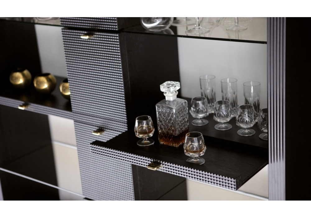 Dimitri von Castello Lagravinese Studio für Opera Contemporary entworfen, ist ein Bücherregal mit 4 Schubladen, 2 Ausziehplatten und Regalen aus Glas. Das Fehlen der Rückwand macht dieses Bücherregal leicht und eignet sich für dekorierte Wände.