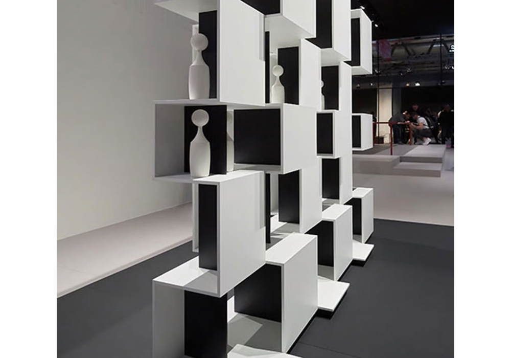 Qubit, von Victor Vasilev für MDF Italia entworfen, ein Bücherregal aus einem einzigen modularen Element, mit dem verschiedene Konfigurationen realisiert werden können. Erhältlich in folgenden vordefinierten Farbkombinationen: mikrogekupferte, matt weiß lackierte Gestell mit vertikalen Trennwänden aus schwarz gebeizter, offenporiger Esche oder mikrogekupferte, matt bleigrau lackierte Gestell mit goldlackierten vertikalen Trennwänden.
