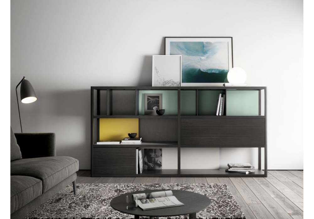 Kai von Iratzoki Lizaso für Treku entworfen, ist ein modulares Bücherregal aus Holz, erhältlich in verschiedenen Holzoberflächen, mit Rückenlehnen und Holztrennwänden in den verfügbaren Oberflächen.