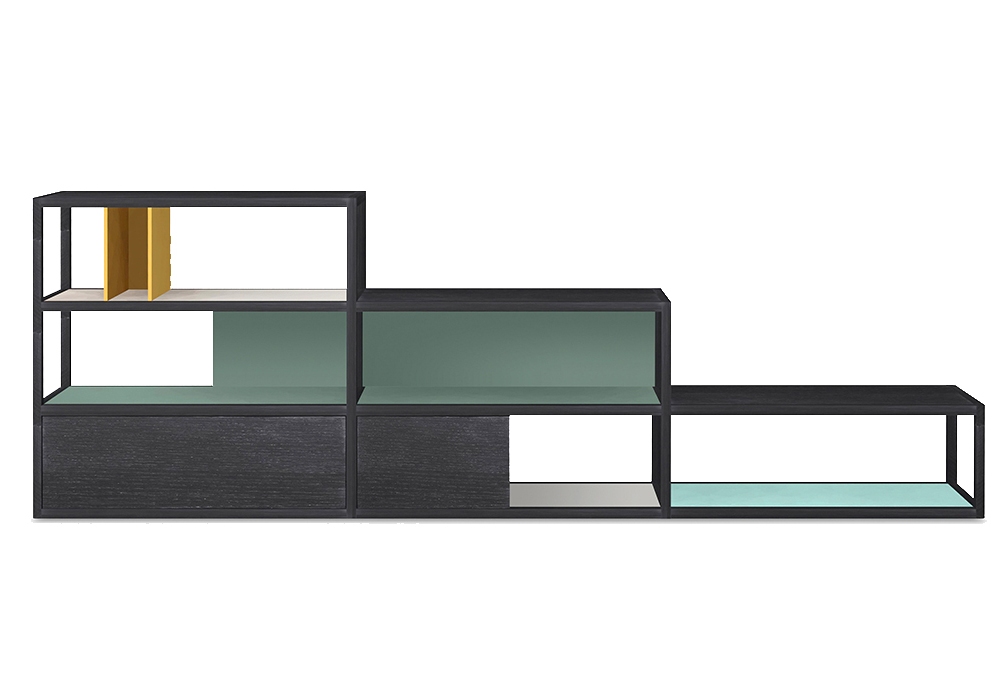 Kai von Iratzoki Lizaso für Treku entworfen, ist ein modulares Bücherregal aus Holz, erhältlich in verschiedenen Holzoberflächen, mit Rückenlehnen und Holztrennwänden in den verfügbaren Oberflächen.